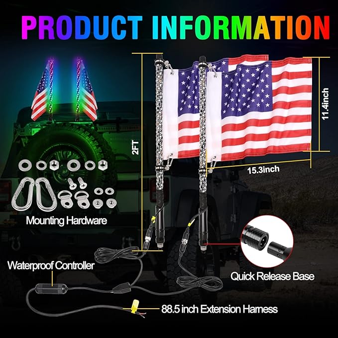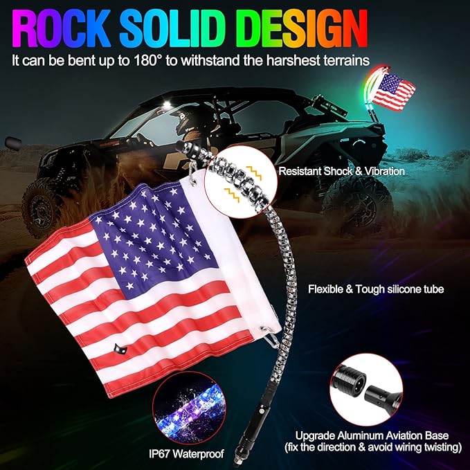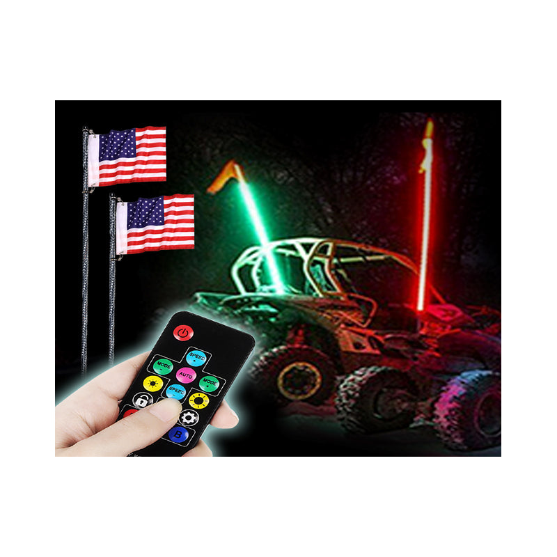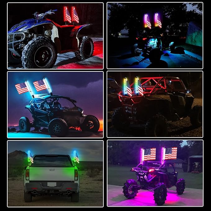 WIDE APPLICATION -- Our strong tube 2 pack 2ft LED whips can be installed in any where you like. Suitable for all DC 9-30V vehicle, such as UTV, ATV, Trucks, Jeep, Dune Buggy, Sand Rail, RZR, Polaris, Go Kart, Off-Road, Motorcycle, Can-Am, Golf Cart etc. High quality multicolored 2pcs RGB LED whips light are durable and reliable way to add creative lighting on your vehicle or as warning flags. 2 Years Warranty & 24 Hours Good After-service.