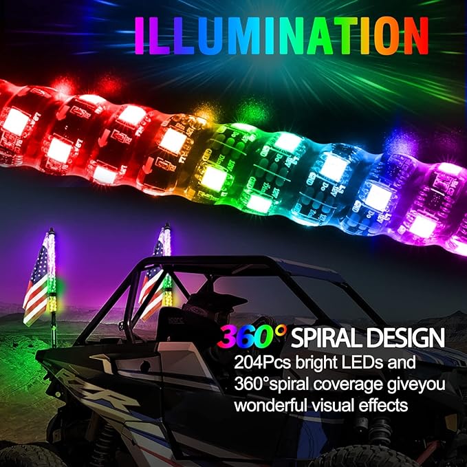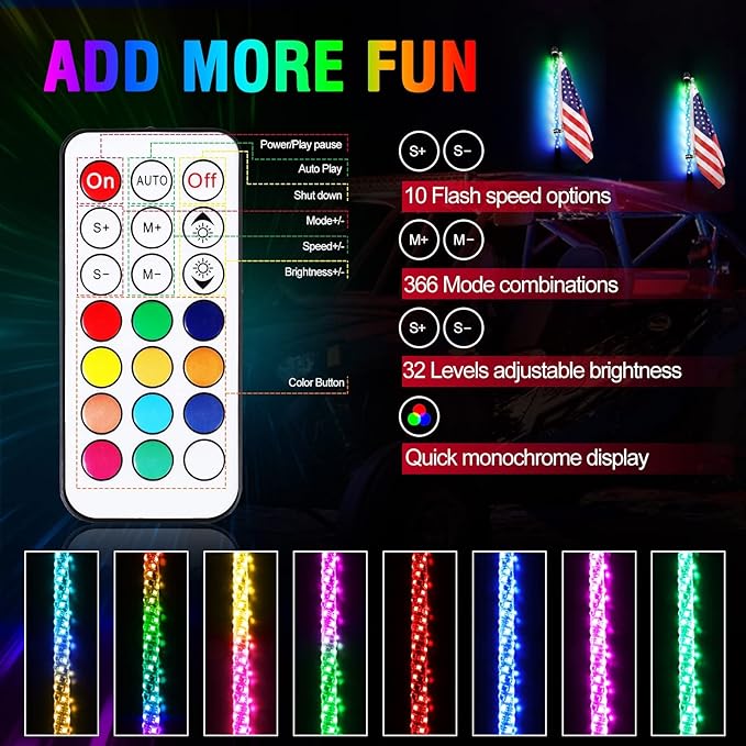 - AWESOME LED WHIP LIGHTS -- Featuring the most efficient 204Pcs high-intensity RGB LEDs, these 2ft LED whip lights provide vibrant dream wrapping color which giving you creative and safe driving experience. Over 300 patterns, 366 light modes, 32 brightness levels, 10 flash patterns and a sleek black finish will make your vehicle look more awesome and eye catching even in the darkest night!