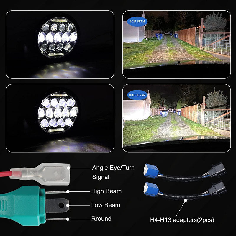 - 【EASY INSTALLATION】Plug & Play, H4 and H13 Adapter Included. Usually You can install the projector round jeep led headlights in 20 minutes or less. With 3 lighting modes - daytime running lights, high beam light and low beam light, improving light projection distance and overall visibility.