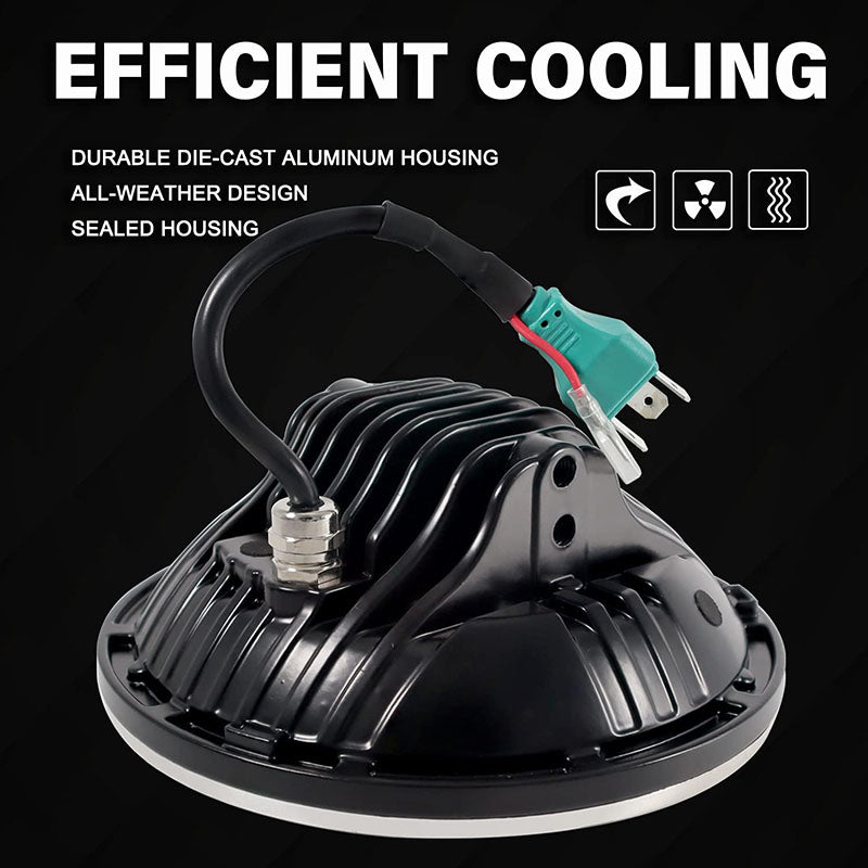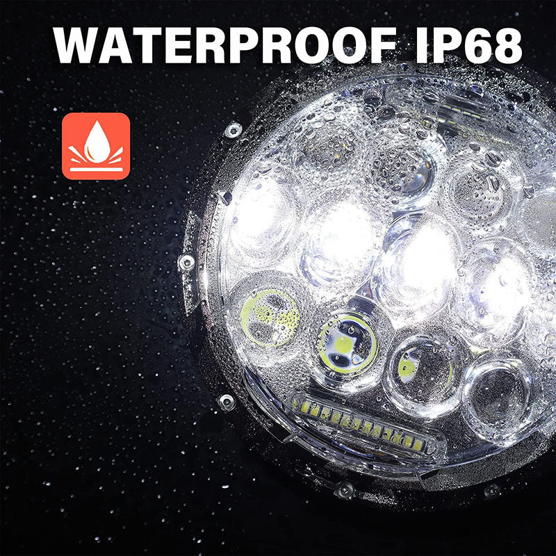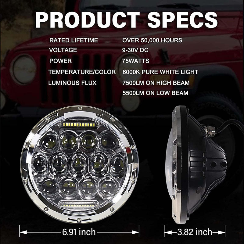 - 【HIGH PERFORMANCE】6000K color temperature for each 7” round headlights with 7500LM high beam and 5500LM low beam make you vision clearer. Over 50000 hours lifespan. Enjoy your happy driving against rain, snow or heavy fog weather with our 7 inch jeep headlights.