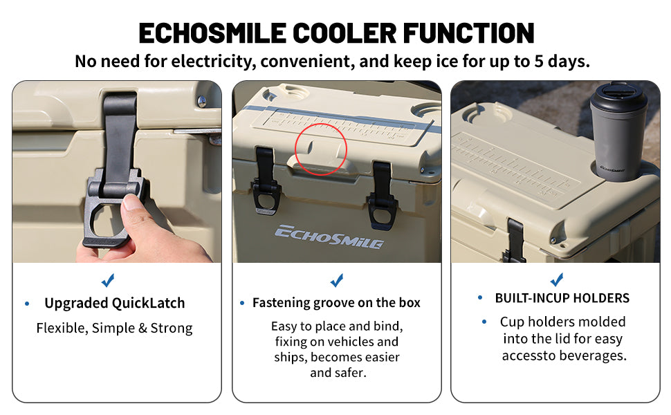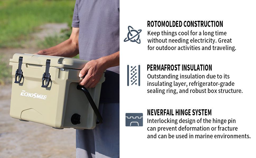 1.Sturdy Rotomolded Design: EchoSmile Rotomolded cooler keeps cold for up to 5 days with recommended 2:1 ice-to-contents.Solid rotary mold ice chests and coolers, with classic surface color and natural luster, use LLDPE material, which is safe & environmentally, sturdy & anti-resistant.