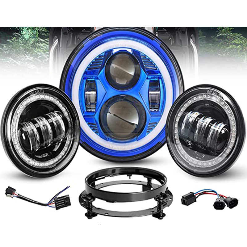 7 Inch Spider Headlights – Blue Withhalo – Black Fog Lights for Harley – Black Bracket for Harley – Three PCS In A Set