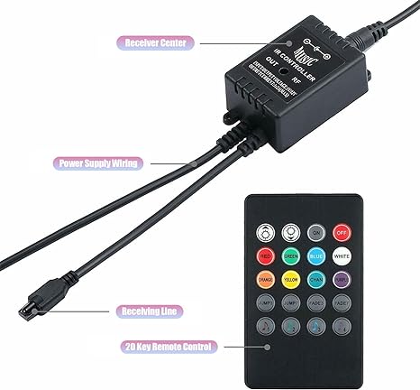 - Control Mode: 4 music control modes, 8 signal color control, brightness control, ON/OFF, 2-segment skip mode control, fade in/out 2 mode control. Please note that: 1. The remote control should point directly to the black receiver box and there is no obstacle between them; 2. The remote should be put near to the receiver box, not too far.