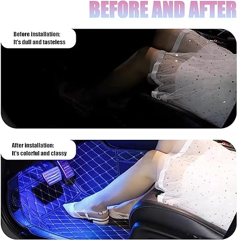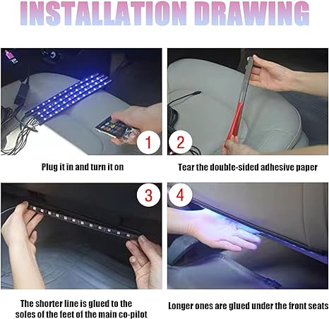- Easy to Install: With cigarette lighter socket. Just plug and play. Peel off the double-sided tape and paste the car led light strips under the seats or in the footwell area. Finally press on the cigarette lighter switch, then begin to enjoy the colorful lights. Only for 12V.