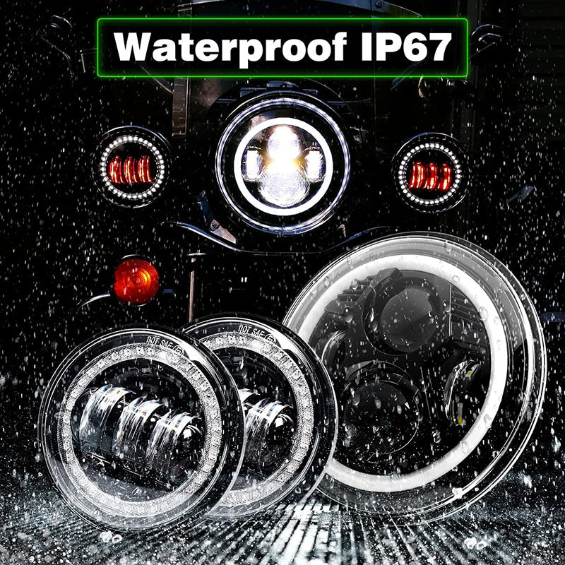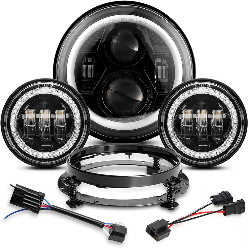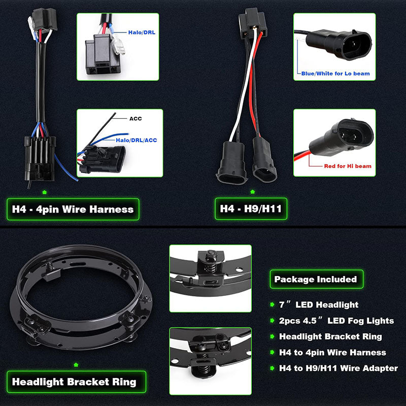 - PACKAGE INCLUDE: 1 PC 7 inch led headlight; 2 PCS 4.5 inch fog lamp; 1 PC 7 inch adapter ring; 1 PC H4-H9/H11 wire; 1 PCSH4 to 4pin wire Harness. 1 year warranty and friendly reply within 24-hour. Please feel free to contact us with any problems before or after purchase.