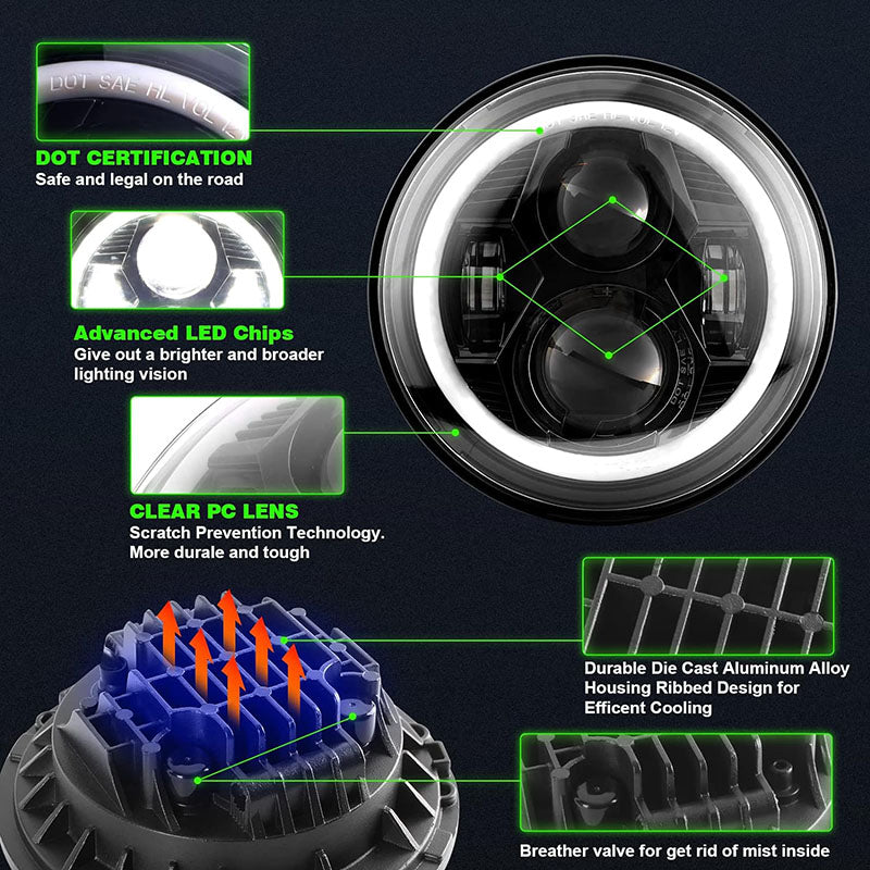- ENHANCE DRIVER VISIBILITY: 4500LM@High Beam, 3200LM@Low Beam for 7’’ headlight, 2880LM for passing light. 7 inch led headlight is made with 100% original LED Chips, providing a sharp beam and mega illumination, providing a broad vision at night fort your safety purposes.
