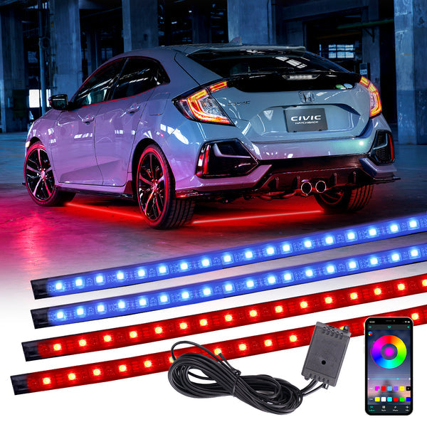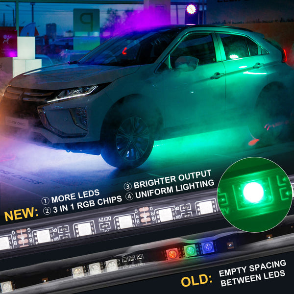 ● Higher Luminosity & DIY Music Sync: RGB Car Underglow Light has High Intensity SMD 5050 LED Chips. 3 In 1 RGB Chips, Brighter Output ,Uniform Lighting. Enhances the Look and Feel of your Vehicle with Brilliant Lighting Effects.With a mic on phone, you can sync your music to your car lights with ease.