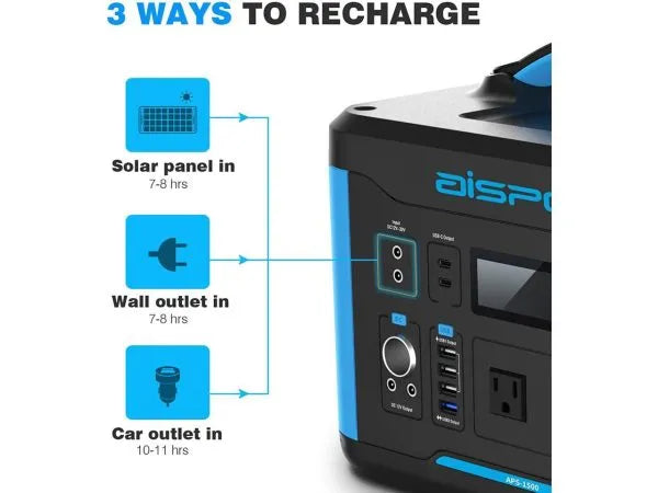 - 3 Charging Ways: AISPEX power station features a DC5521(5.5mm*2.1mm) input port that supports 200W Max input power. It can be recharged by three ways: 1)Recharging by 200W AC adapter; 2)Recharging by 12V/10A car outlet(Car charger included); 3)Recharging by 200watt solar panel (not included, please visit more at AISPEX store)