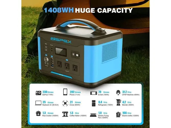 - Sustain Your Everyday Devices: Featuring a pure sine wave output of 1500W, the AISPEX power station is a must-have for charging your daily devices. APS-1500 can even run devices with rated power up to 3000 watts (It’s primarily suitable for resistive loads such as lights, space heaters, toasters, ovens, and coffee makers.)