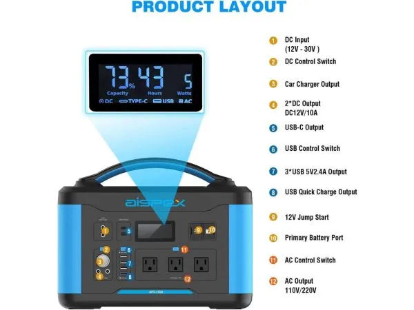 - Charging Up To 12 Devices Simultaneously: AISPEX 1500W power station has a complete output ports including 3*110V/1500W AC Outlets, 2*12V/10A DC5521 Outputs, 1* 12V/10A Car Port, 4*USB-A Output, 2*TYPE C PD 100W Output, 1* 1000A max Jumper Starter and LCD screen. Looking to streamline the clutter of charging multiple devices? Simplify your setup by using just one power station.