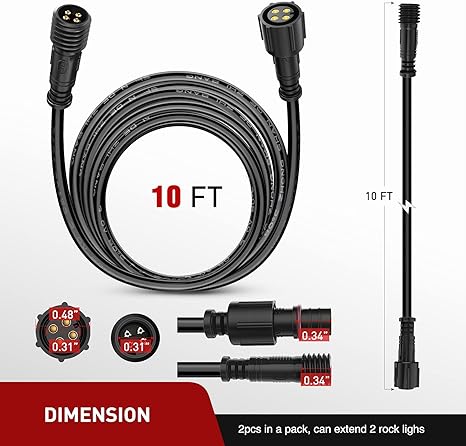 Easy Installation: Just plug and play with female connector on controller box wire and male connector on rock light wire, perfect match without issue. Package Include: 2PCS 10FT Extension Wire. 2 Years Warranty Honored by Nilight.