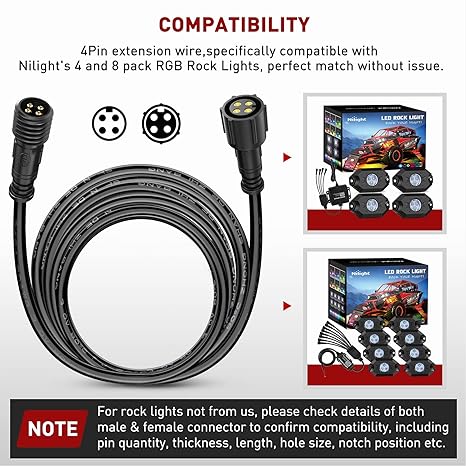 Specifically designed to fit for Nilight 4 and 8 pods RGB rock light kits, ASIN: B01MG5UXV4 and B08KF88G32, to provide extra wire in the rock light connection, especially for your pickup truck Jeep etc full size vehicle. Each set of the extension can extend two rock lights.
