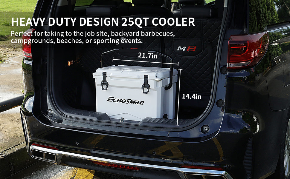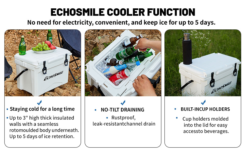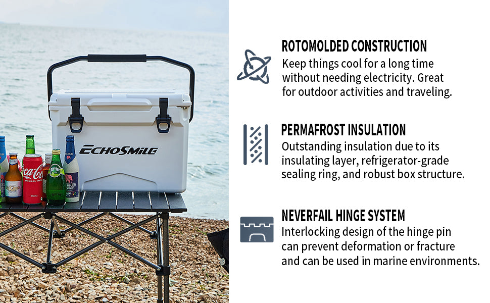 ① ICE RETENTION: EchoSmile Rotomolded cooler keeps cold for up to 5 days with recommended 2:1 ice-to-contents. The intermediate insulation layer is made of polyurethane so as to provide superior insulative and high strength. The silicone sealing ring seals the whole space to avoid heat convection and prolong the cryopreservation time.