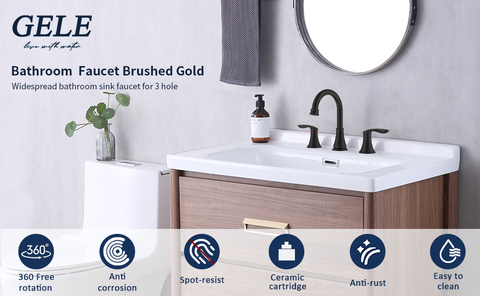 - Brushed Gold Finish and Extremely durable material- Brushed Gold coating of the bathroom faucet allows the resist corrosion, rust, scratching, suitable for different bathroom decoration styles and bring a sense of luxury. All the metal connector parts and high-performance ceramic valves of the bathroom faucet 3 hole have high durability assurance, 100% Lead-Free.