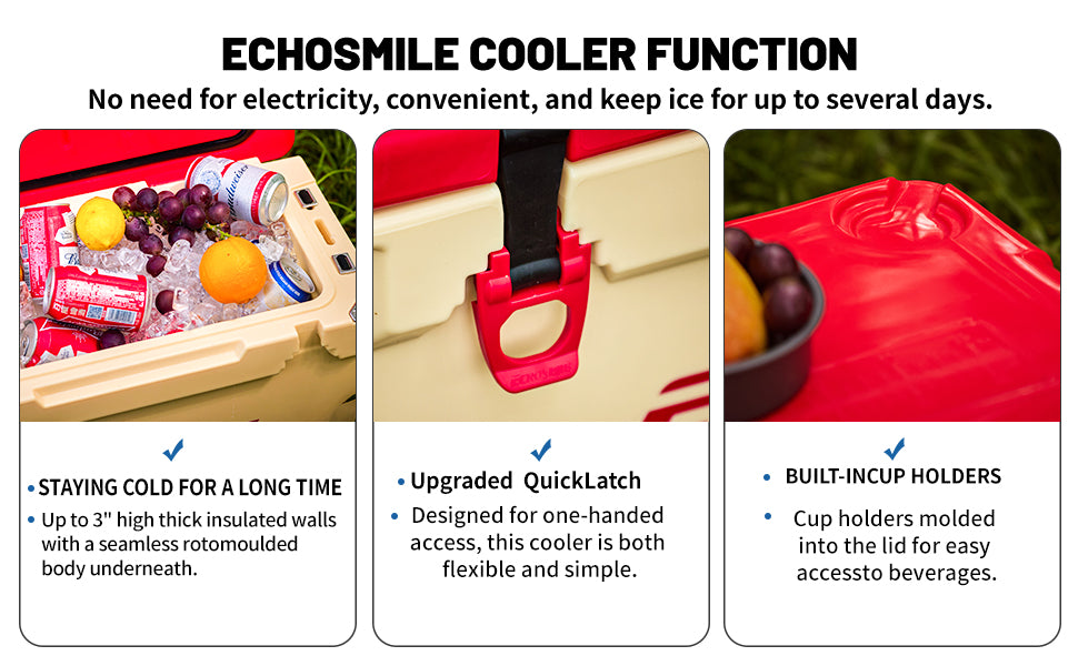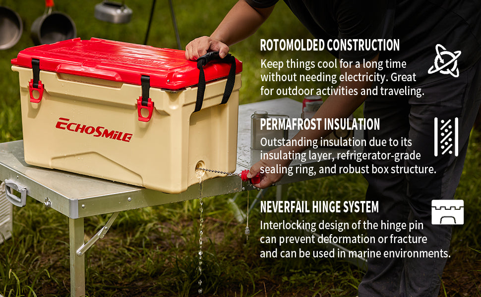 1.Sturdy Rotomolded Design: EchoSmile Rotomolded cooler keeps cold for up to 5 days with recommended 2:1 ice-to-contents.Solid rotary mold ice chests and coolers, with classic surface color and natural luster, use LLDPE material, which is safe & environmentally, sturdy & anti-resistant.