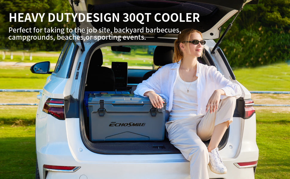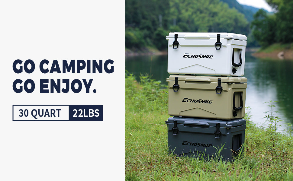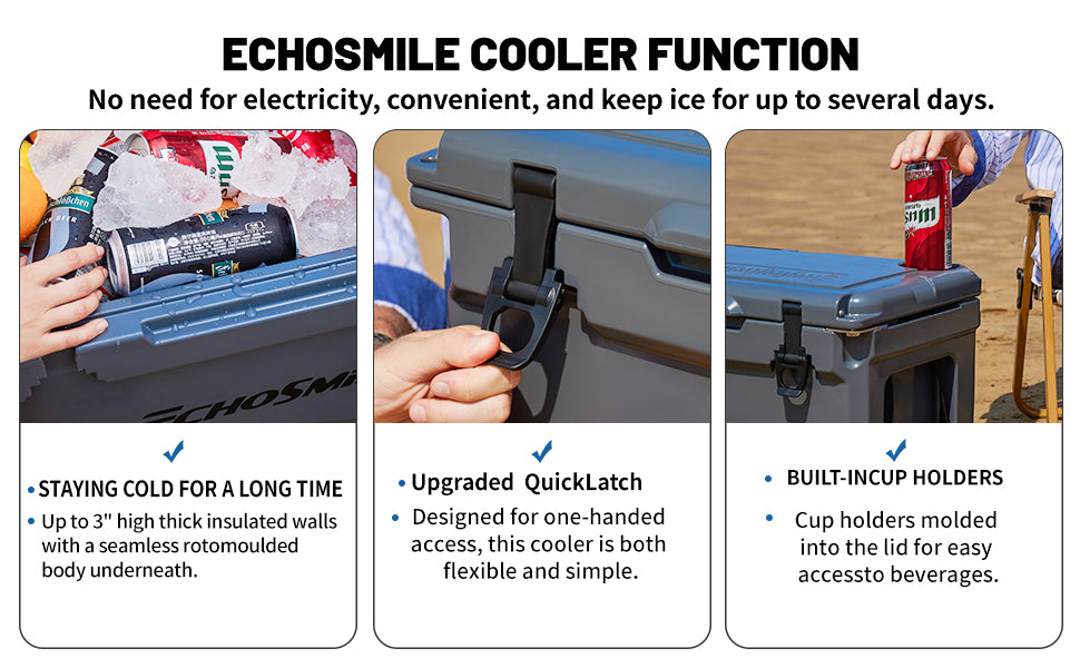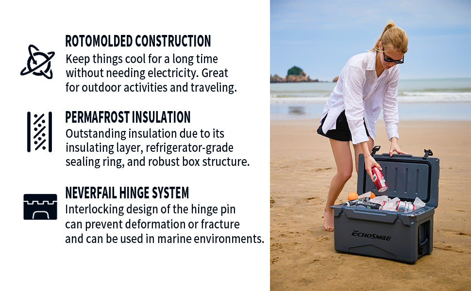① ICE RETENTION: EchoSmile Rotomolded cooler keeps cold for up to 5 days with recommended 2:1 ice-to-contents. The intermediate insulation layer is made of polyurethane so as to provide superior insulative and high strength. The silicone sealing ring seals the whole space to avoid heat convection and prolong the cryopreservation time.