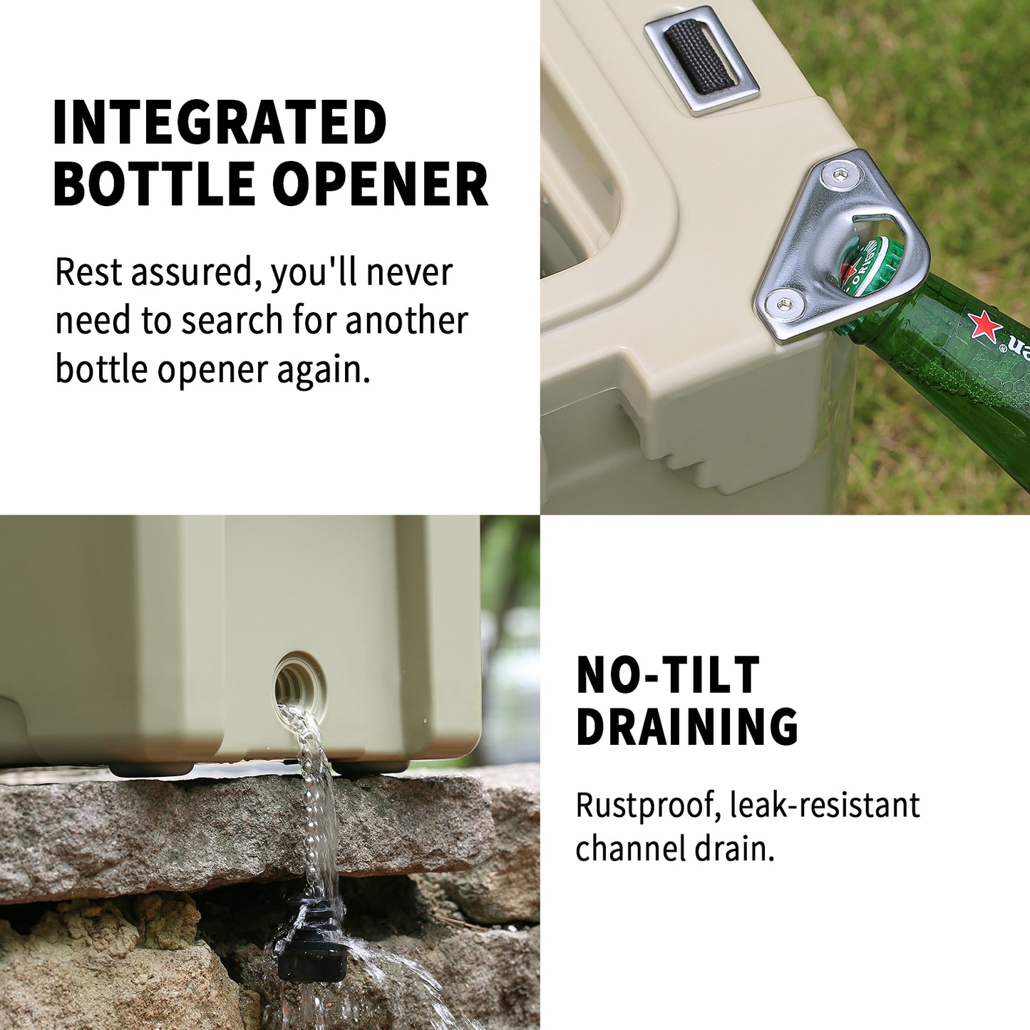 ③ STURDY ROTOMOLDED CONSTRUCTION: Solid rotary mold ice chests and coolers, with classic surface color and natural luster, use LLDPE material, which is safe & environmental-friendly, sturdy & anti-resistant, inside(food grade) and outside(UV resistance).