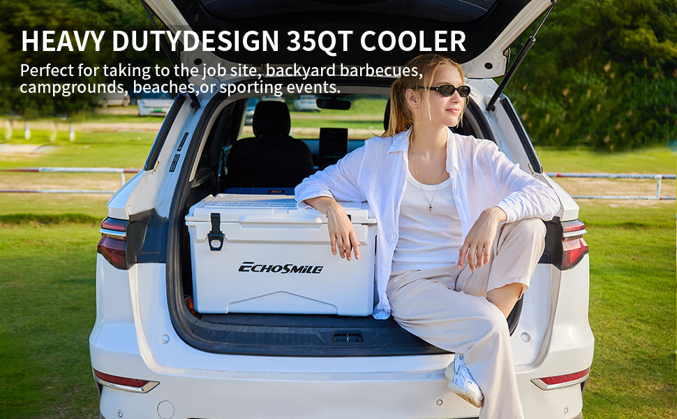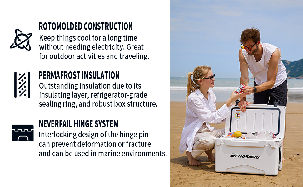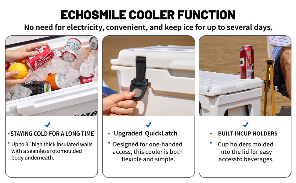① ICE RETENTION: EchoSmile Rotomolded cooler keeps cold for up to 5 days with recommended 2:1 ice-to-contents. The intermediate insulation layer is made of polyurethane so as to provide superior insulative and high strength. The silicone sealing ring seals the whole space to avoid heat convection and prolong the cryopreservation time.