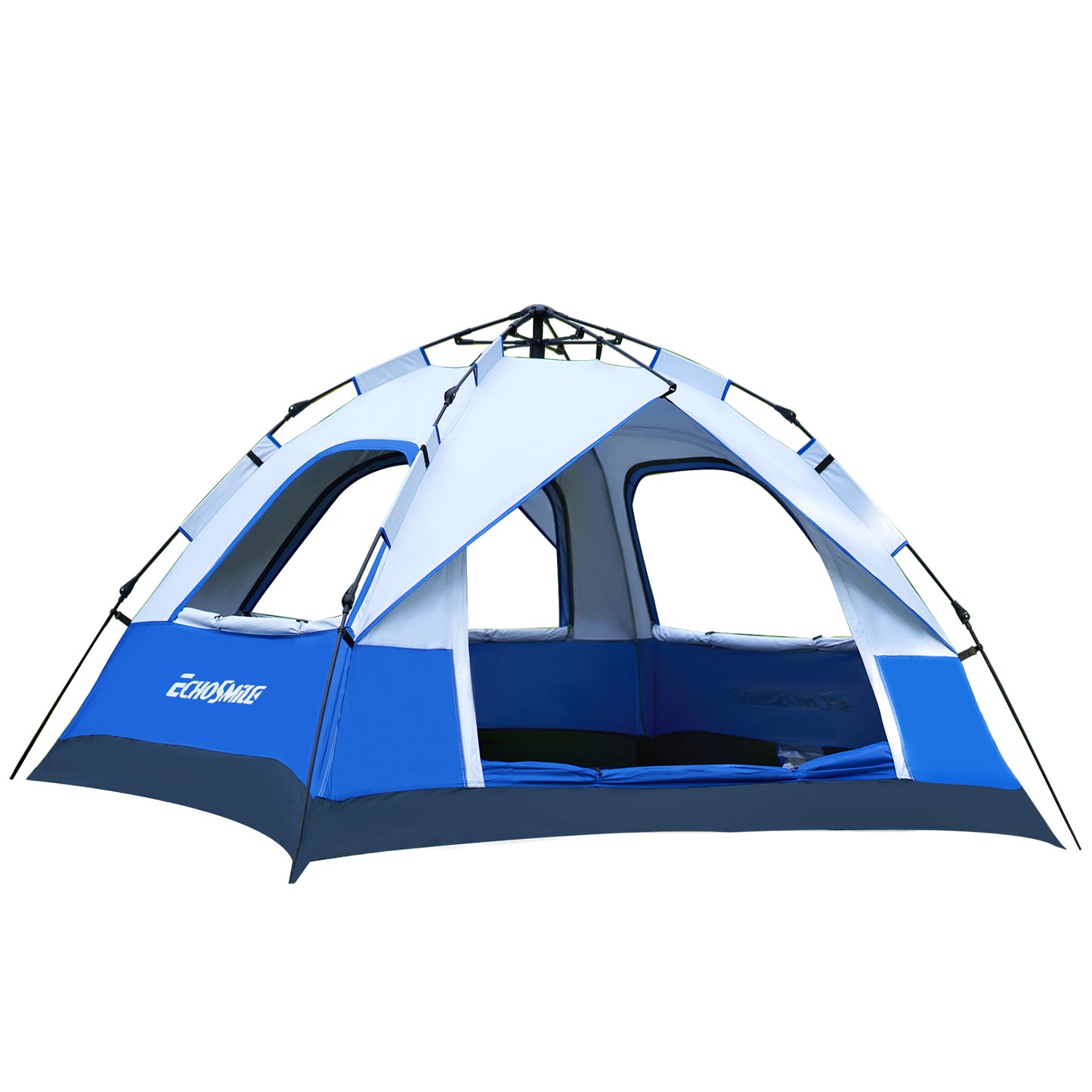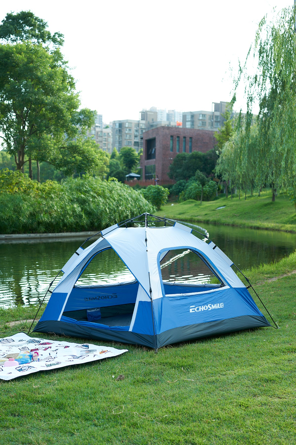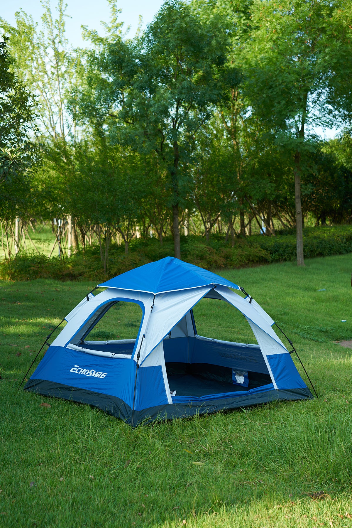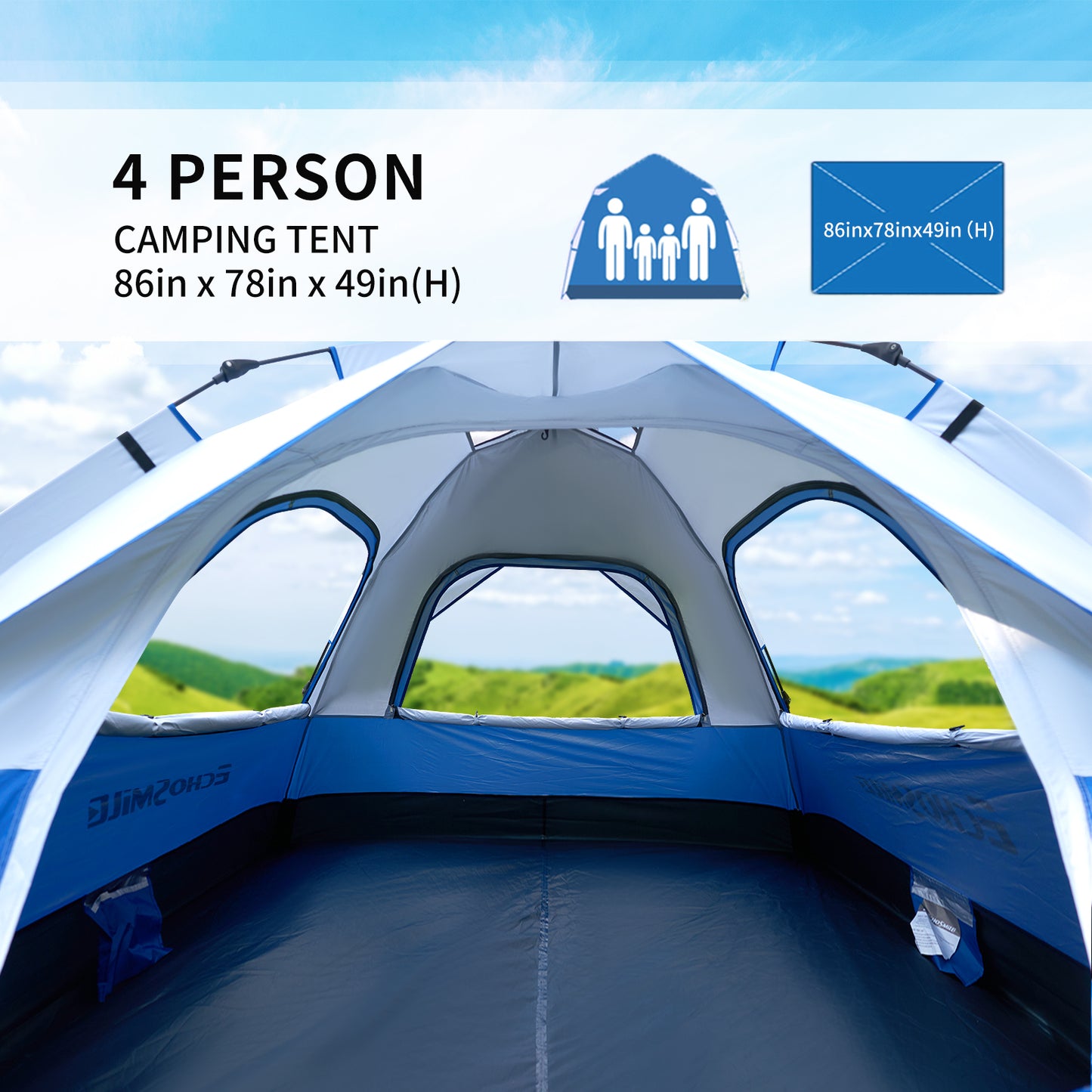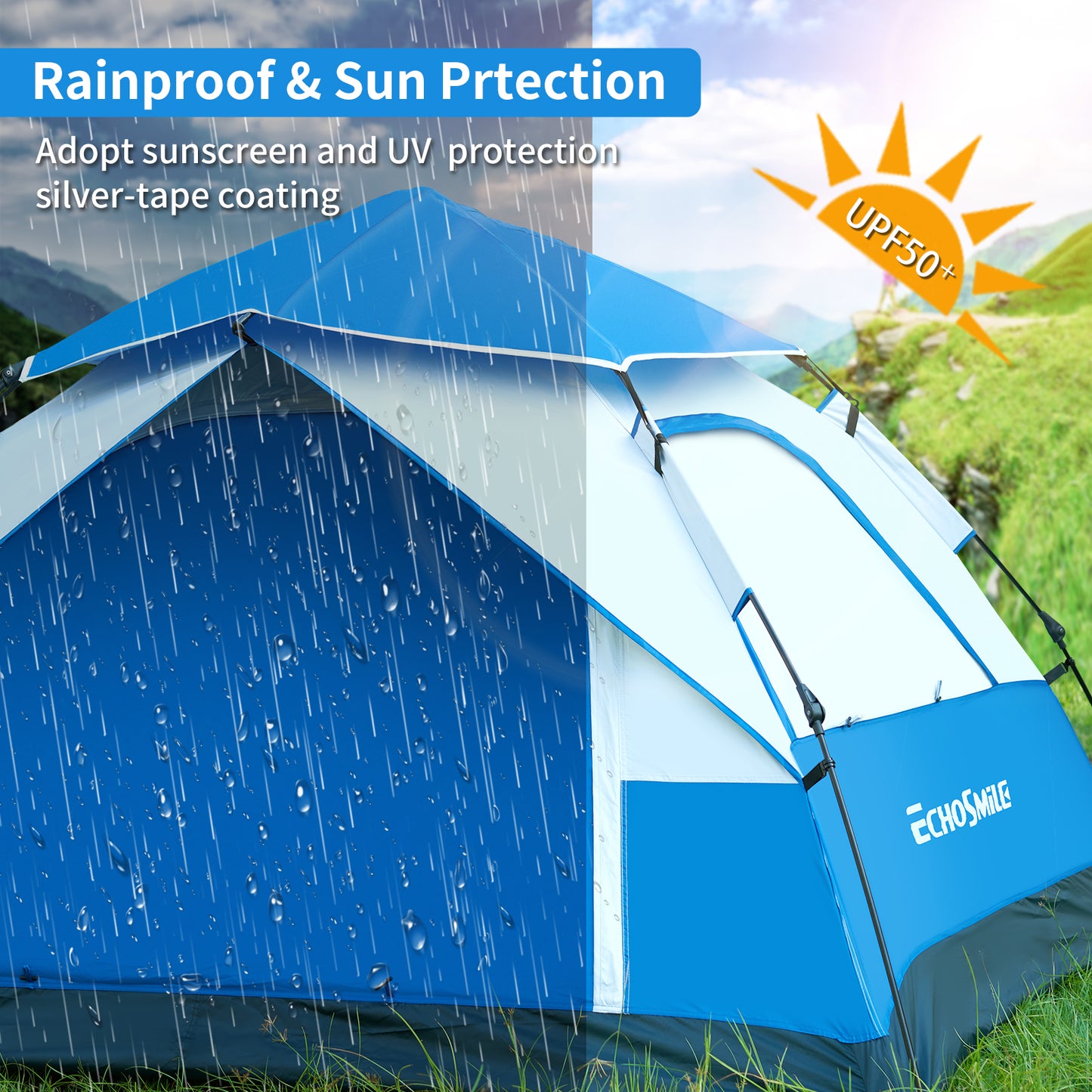 ③Waterproof and UV Protection: The EchoSmile easy setup tent features 190T PU polyester fabric and 2000mm PU coating, effectively preventing water from seeping into the tent. With UPF 50+ sun protection and durable fiberglass poles, it's perfect for adventurous trips.
