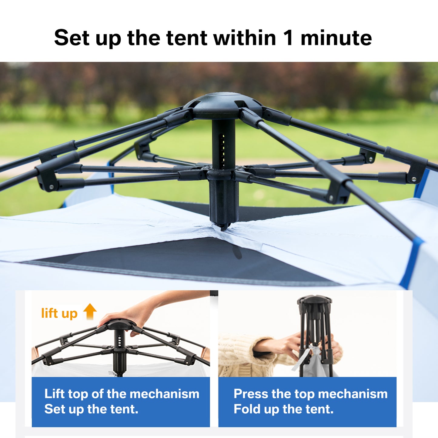 ①Easy Folding: Our pop up tent features a convenient folding design, allowing for quick and hassle-free setup and takedown. Unpack it from the carrying bag and with a few simple steps, you can quickly set up a fully functional tent.