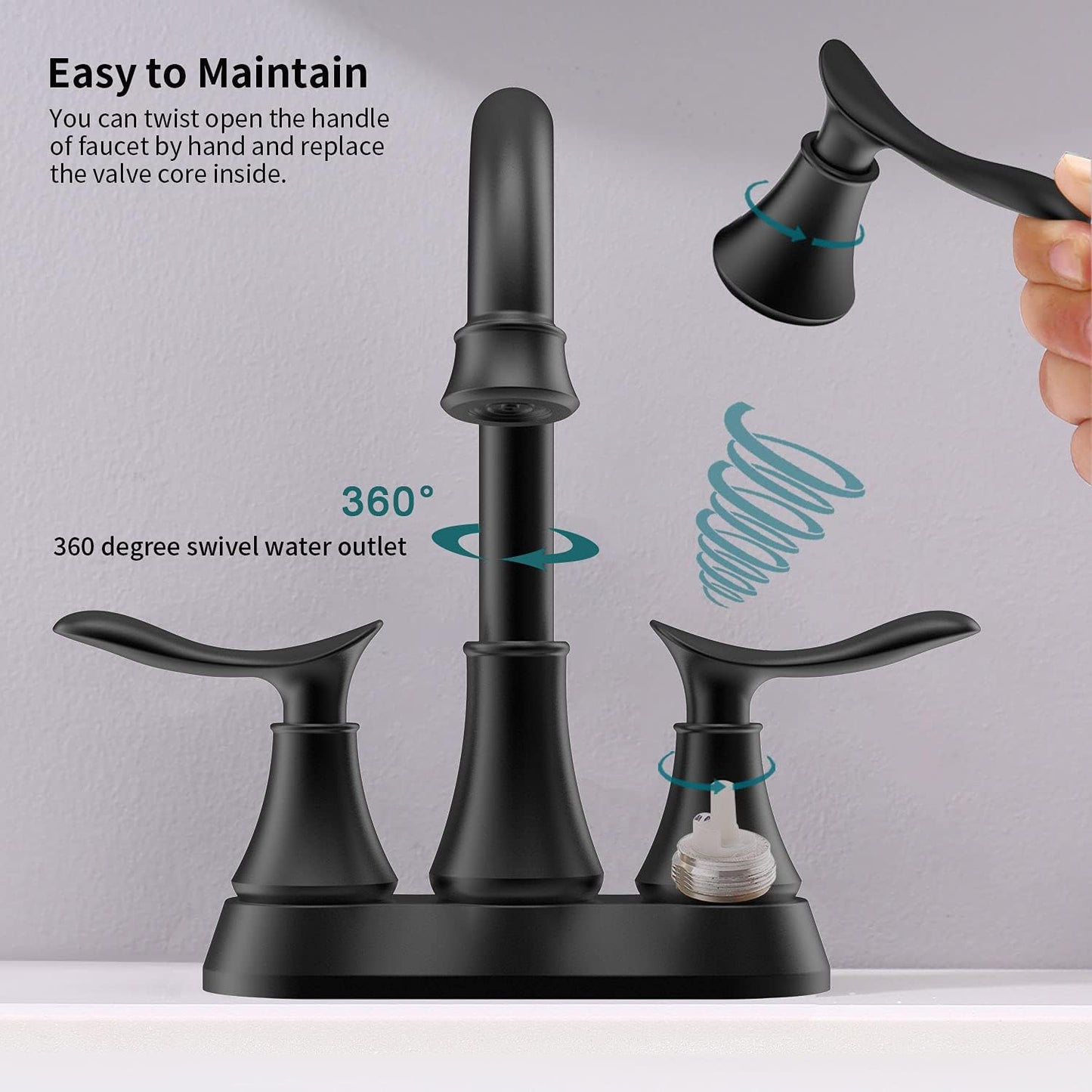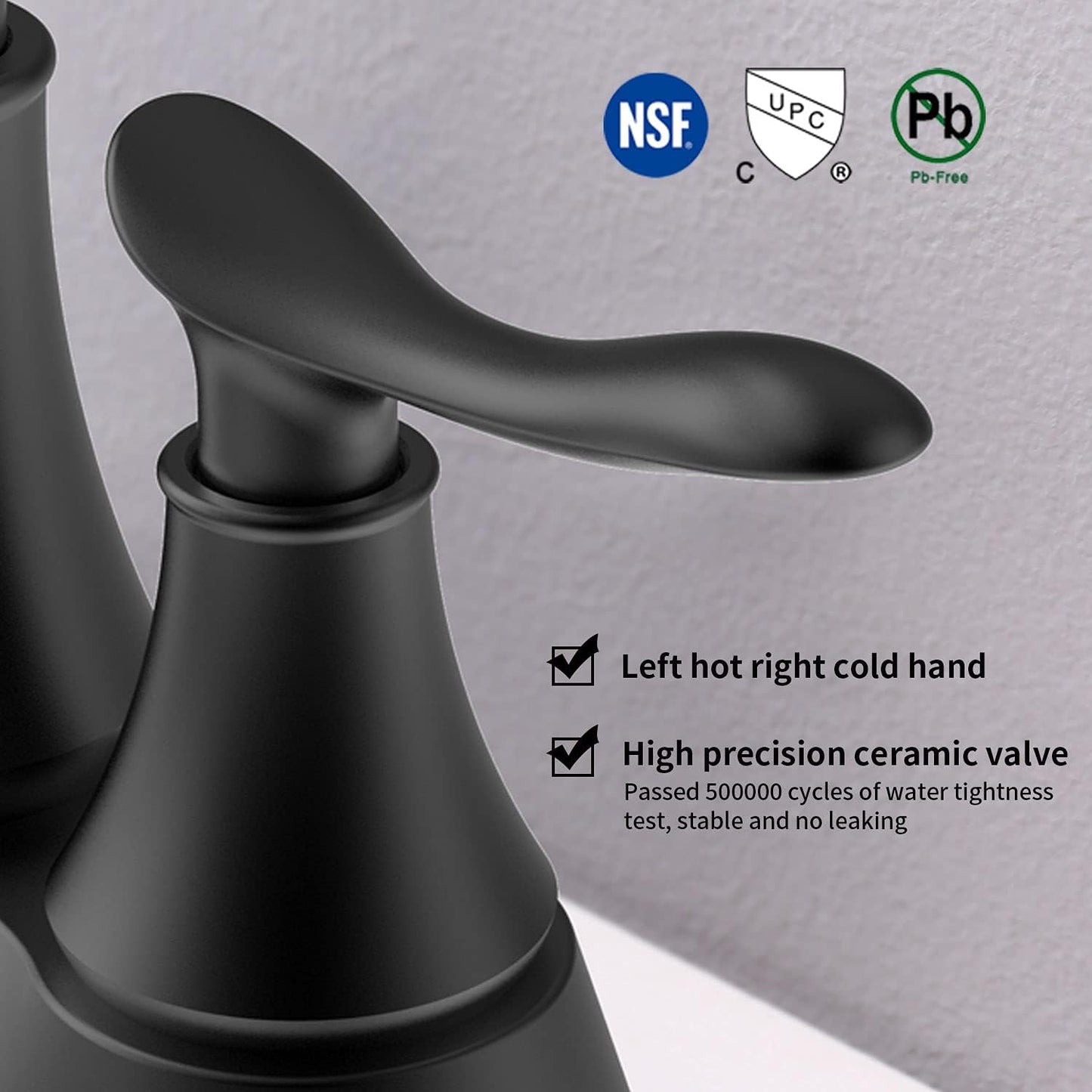 - 💧【 TWO-HANDLE METAL LEVER 】- Two handle lever bathroom faucet design for precise control in both volume and water temperature. The handle torque can reach up to 18MM, which greatly extends the handle life.(The current industry standard is 9MM). The high-quality ceramic & copper cartridge has passed 500,000 cycles of water tightness test to ensure that the brushed matt black bathroom faucet is stable.