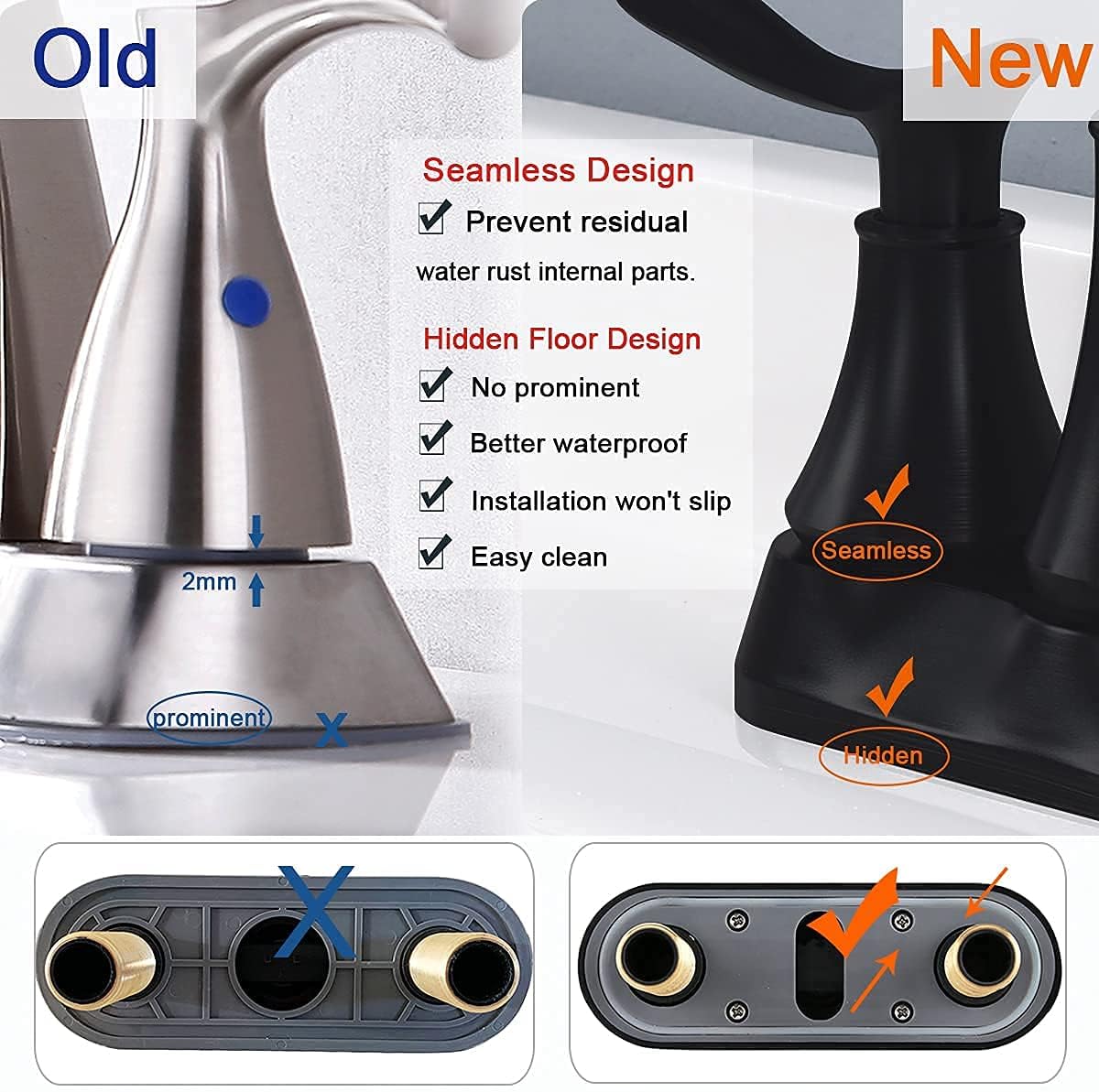 - 💧【 PREMIUM MATERIAL & DESIGN 】- Exquisite faucet for bathroom sink, anti-scratch, resist rust, corrosion and tarnish, no water spot and finger print. Hidden bottom floor design : No prominent; Better water proof ( Prevent residual water rust Internal parts ) Exceed industry longevity standards, ensuring durable performance for life. Flow Rate: 1.2GPM 4.46L/min.