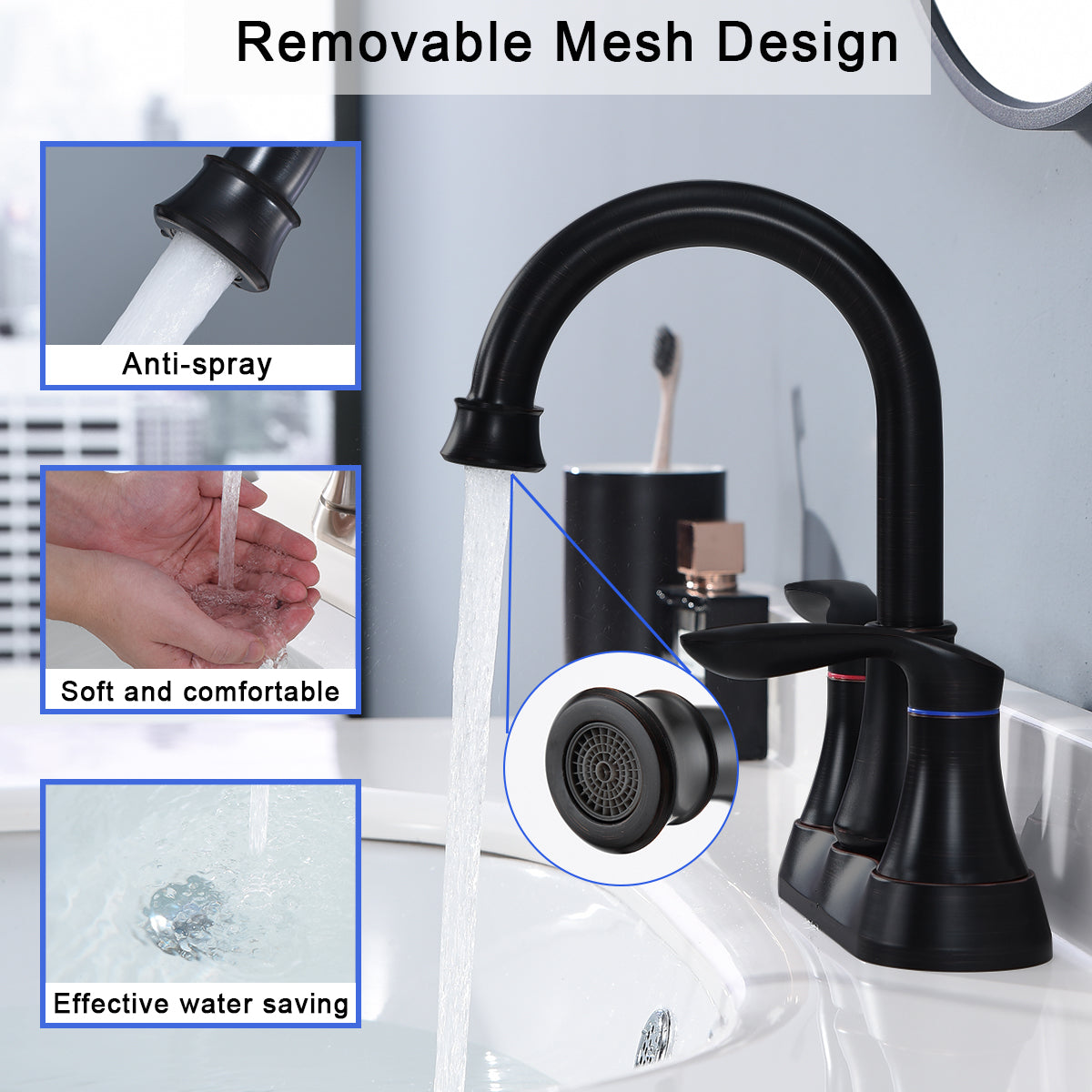 - 💧【 WATER EFFICIENT 】- The ABS aerator of 3-hole mount 4 inch centerset bathroom sink faucet imported strengthens the foaming effect of the dense, the water flow is dense and soft without splashing,improve water efficient. Detachable aerator, you can clear hard water blockage at any time. Suitable for rent house, new condo, single-apartment, motor home, travel trailer and family use.