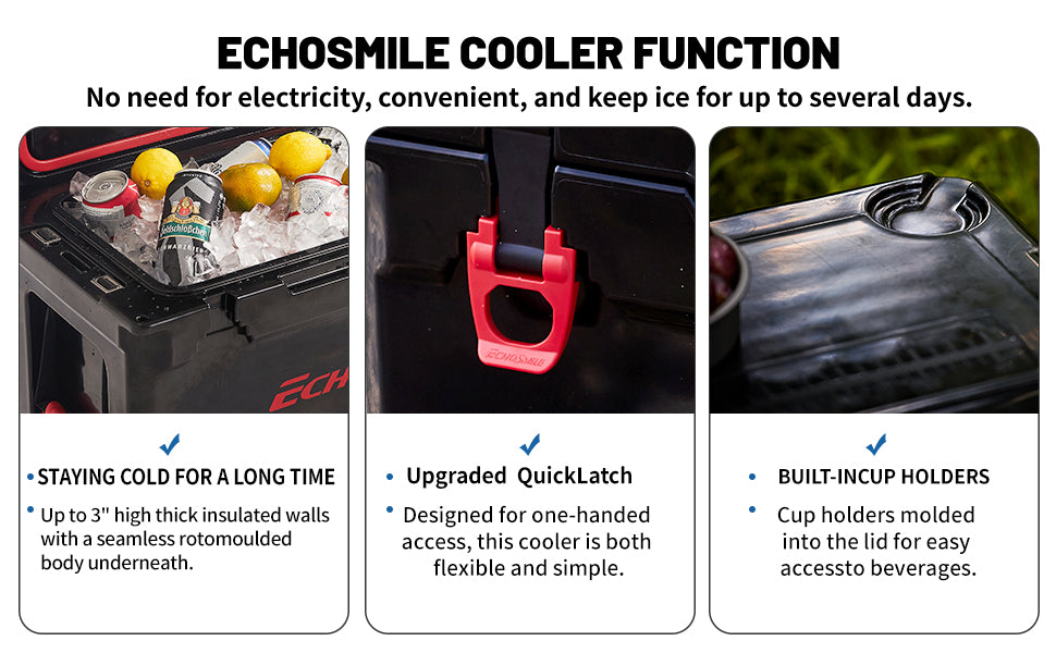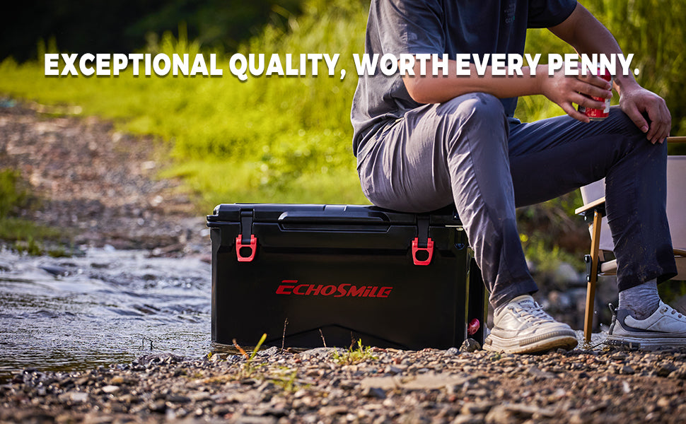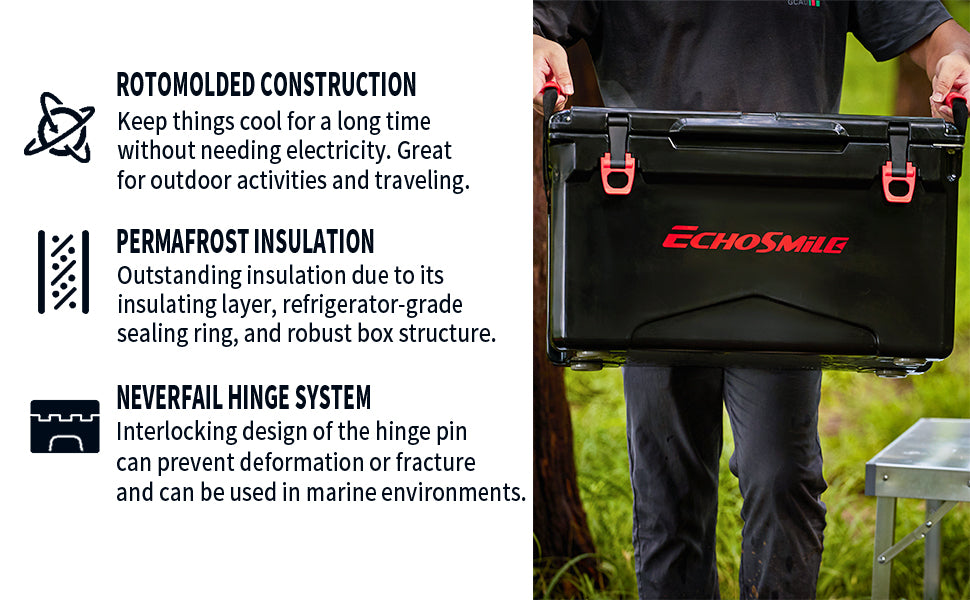 ① ICE RETENTION: EchoSmile Rotomolded cooler keeps cold for up to 5 days with recommended 2:1 ice-to-contents. The intermediate insulation layer is made of polyurethane so as to provide superior insulative and high strength. The silicone sealing ring seals the whole space to avoid heat convection and prolong the cryopreservation time.
