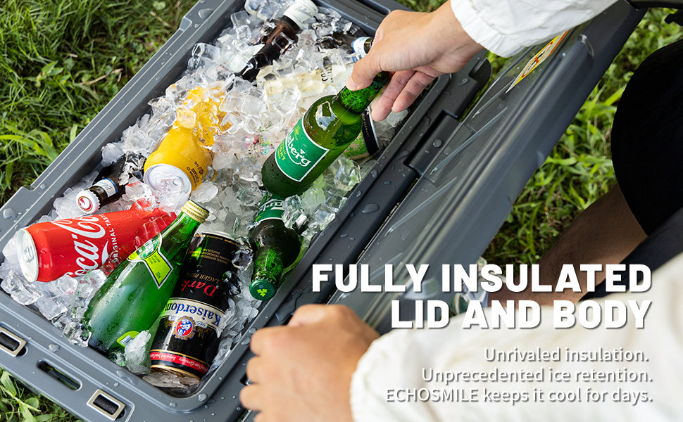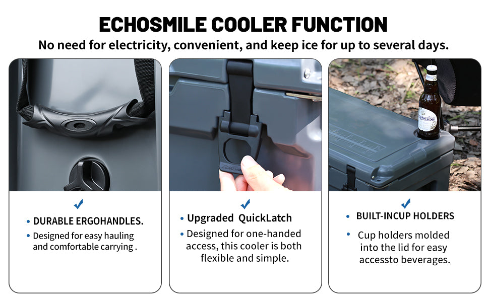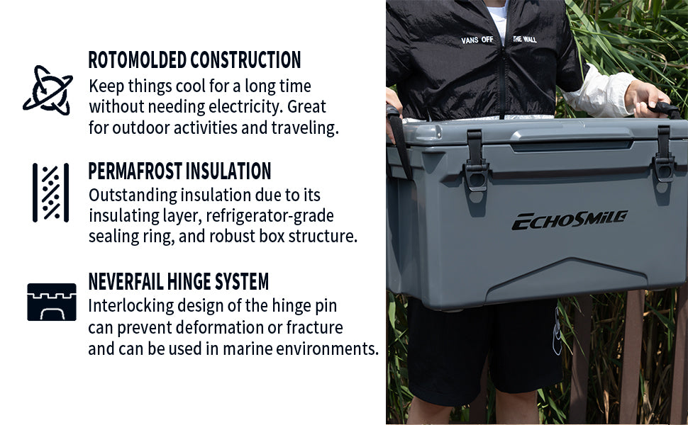 ① ICE RETENTION: EchoSmile Rotomolded cooler keeps cold for up to 5 days with recommended 2:1 ice-to-contents. The intermediate insulation layer is made of polyurethane so as to provide superior insulative and high strength. The silicone sealing ring seals the whole space to avoid heat convection and prolong the cryopreservation time.