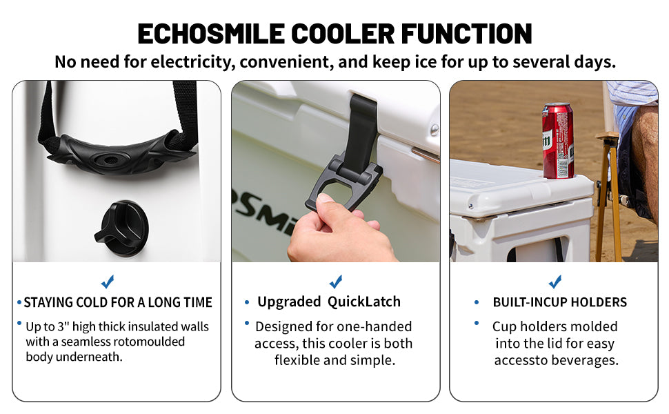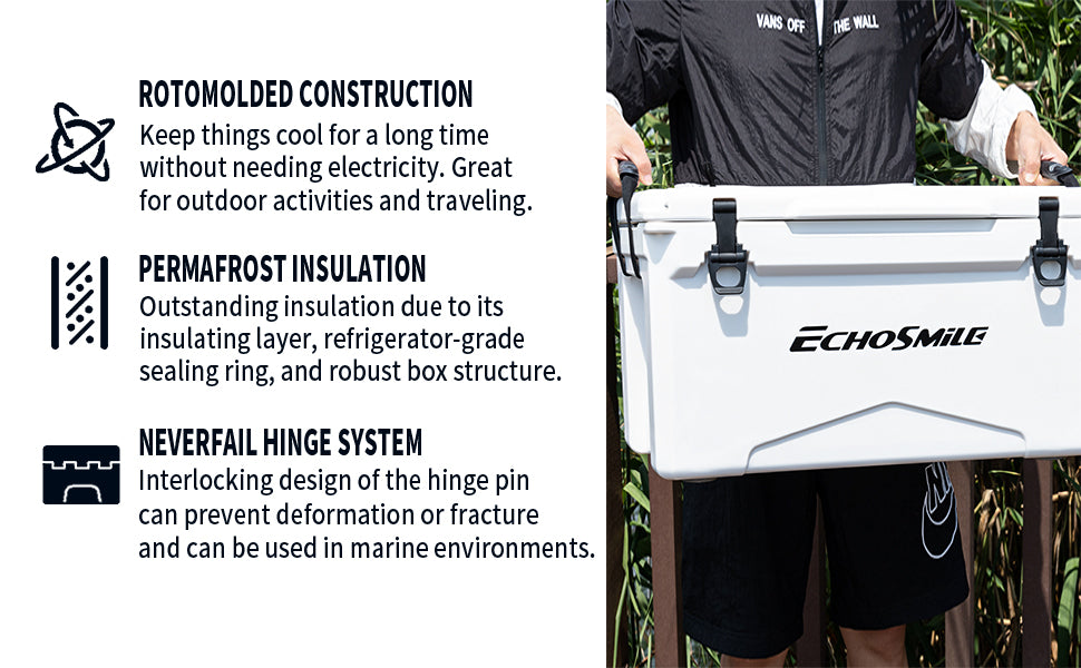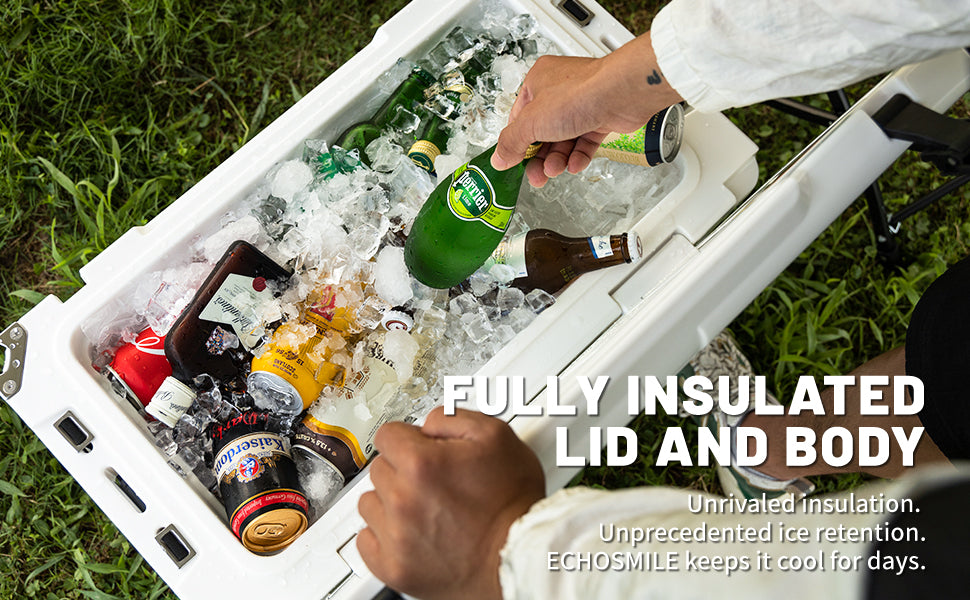 ① ICE RETENTION: EchoSmile Rotomolded cooler keeps cold for up to 5 days with recommended 2:1 ice-to-contents. The intermediate insulation layer is made of polyurethane so as to provide superior insulative and high strength. The silicone sealing ring seals the whole space to avoid heat convection and prolong the cryopreservation time.