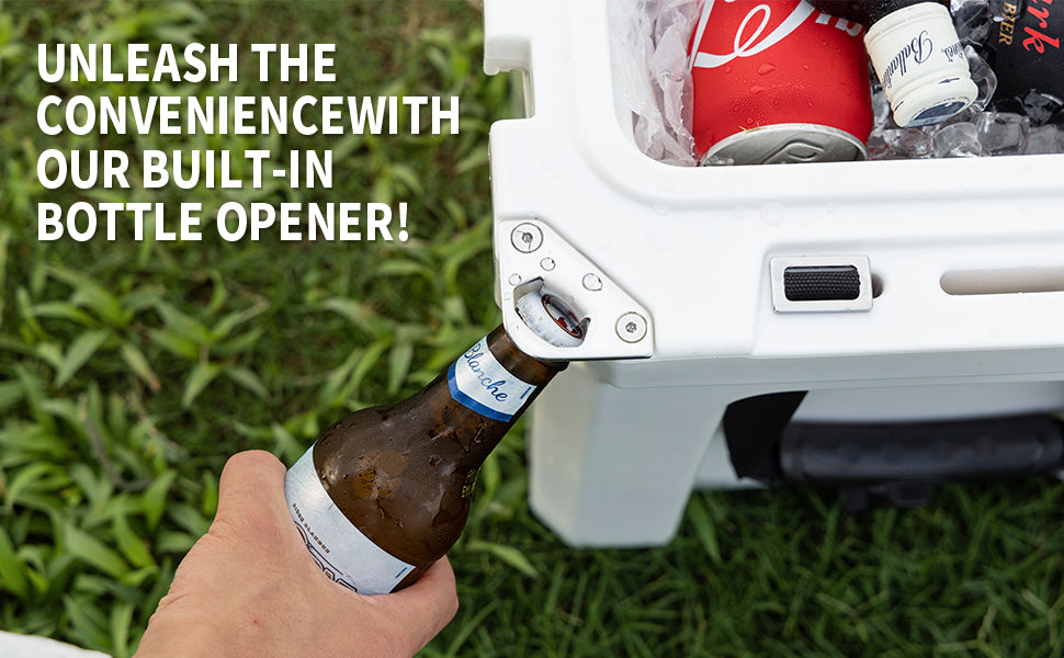 Our rotomolded cooler's rugged design doubles as an additional seat or sturdy table.It can support up to 350 lbs, adding versatility to your outdoor experiences.Attached with a handy chain, the drain plug cap is always within reach when it's time to drain the cooler. Enjoy effortless cleanup after your journeys.