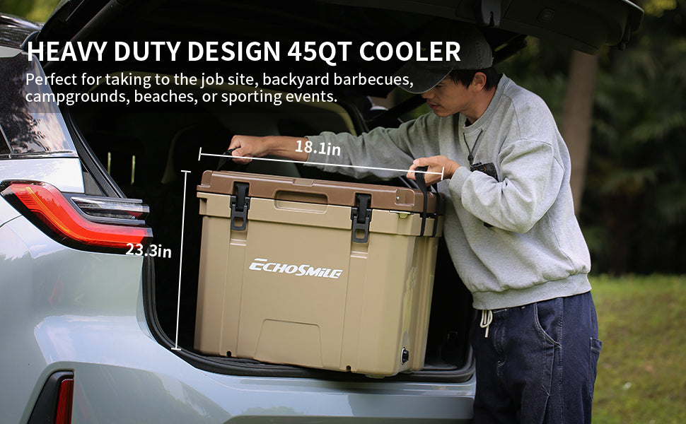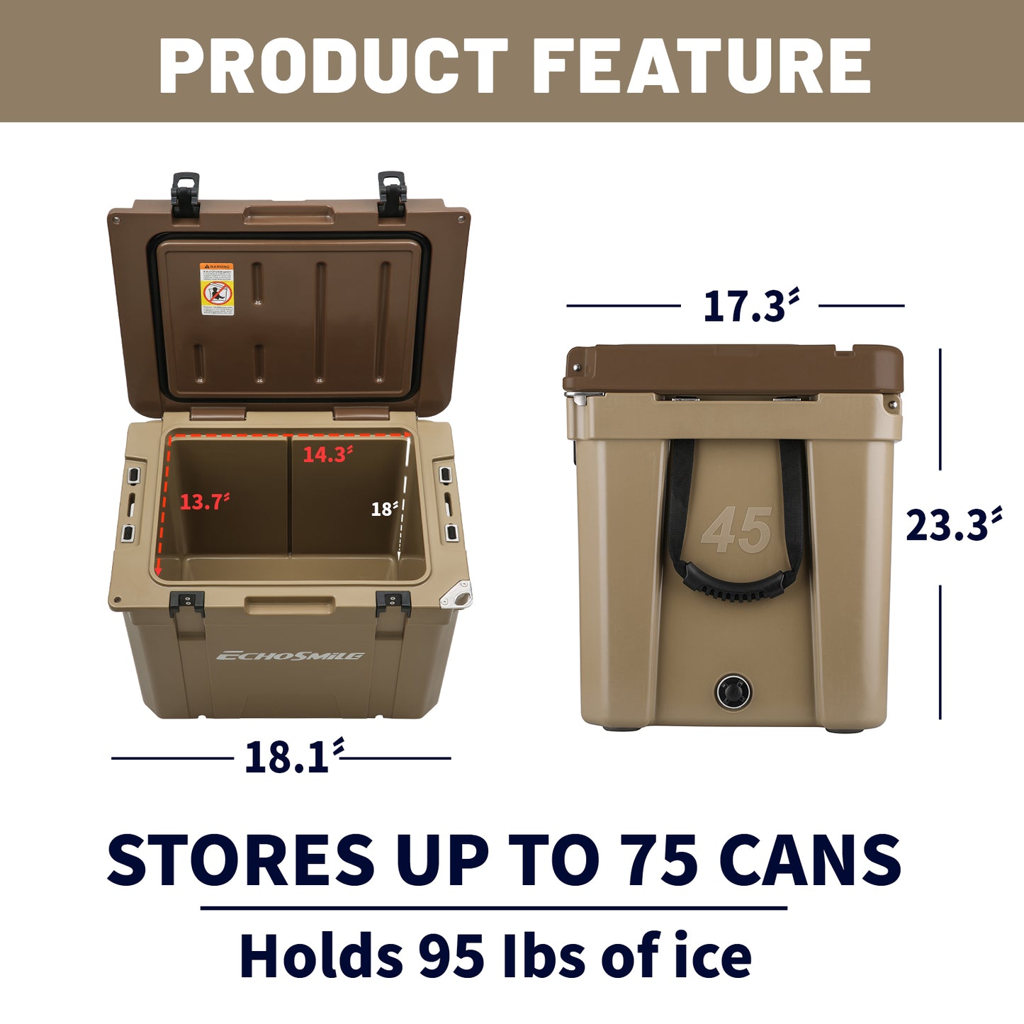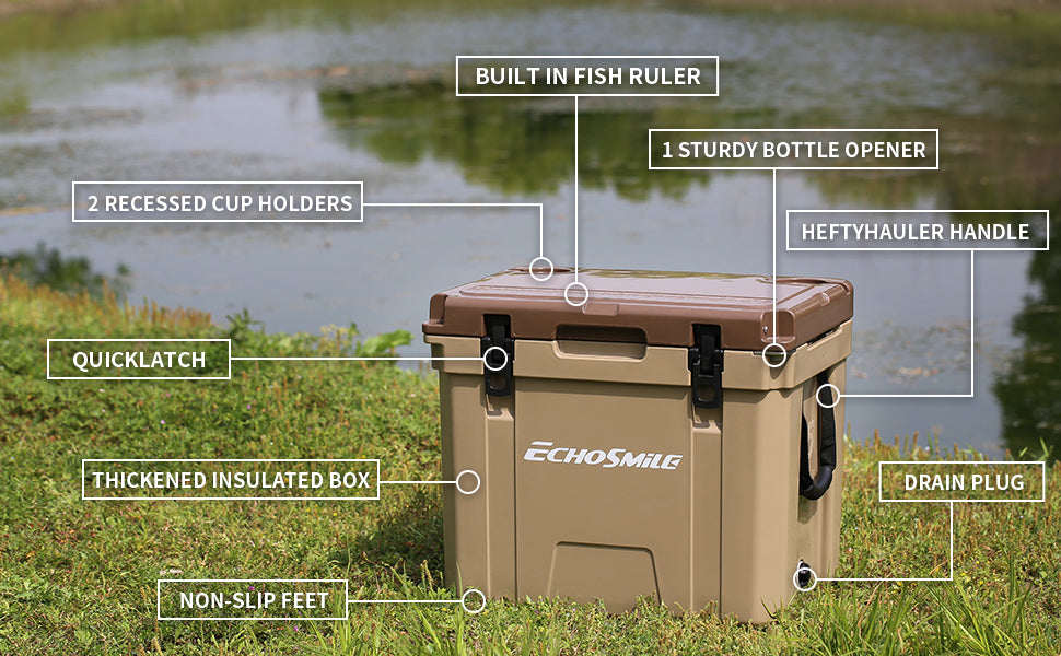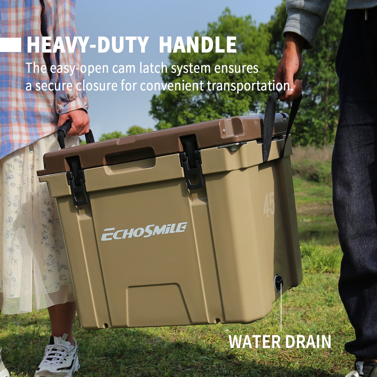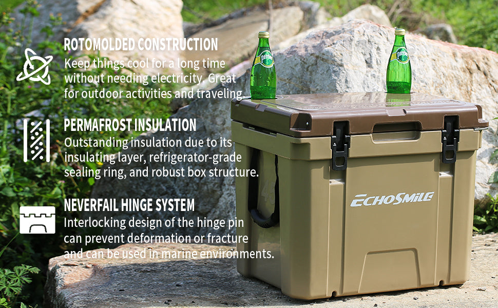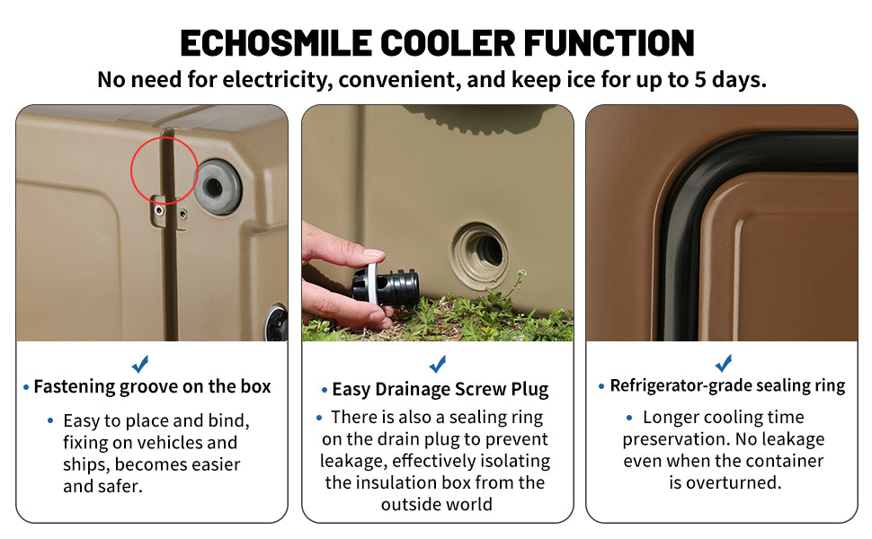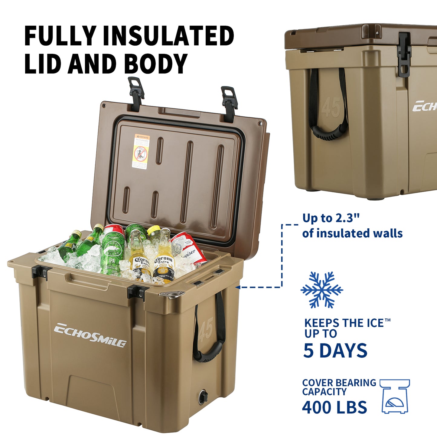 ① Ice retention: EchoSmile coolers are designed with rotomolded construction, constructed with LLDPE material that provides excellent insulation. The intermediate insulation layer is made of polyurethane to provide superior insulation and high strength. EchoSmile's rotomolded cooler is capable of preserving ice for up to 5 days.