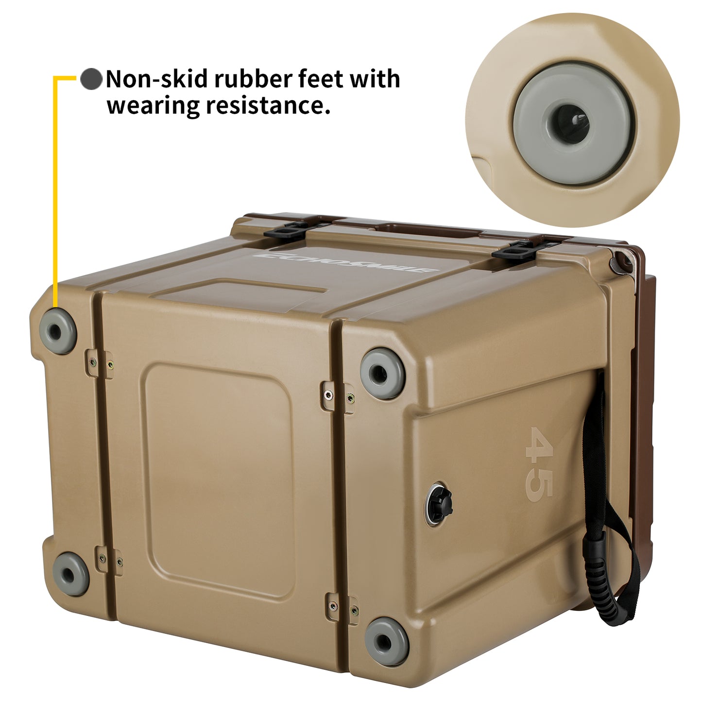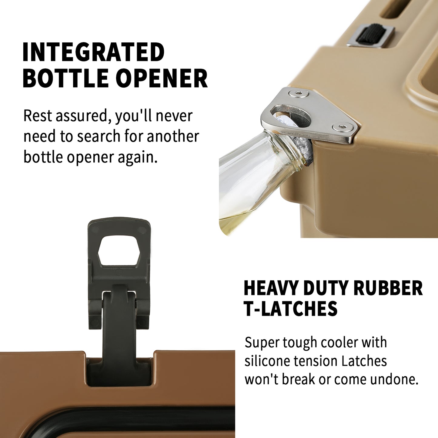 ④ Additional Features: Our ice chests and coolers are designed for convenience and durability. The silicon tension latches are sturdy and won't loosen or break easily. The drain plug allows for easy draining without tipping the cooler over, and non-slip feet keep the cooler in place on uneven surfaces.