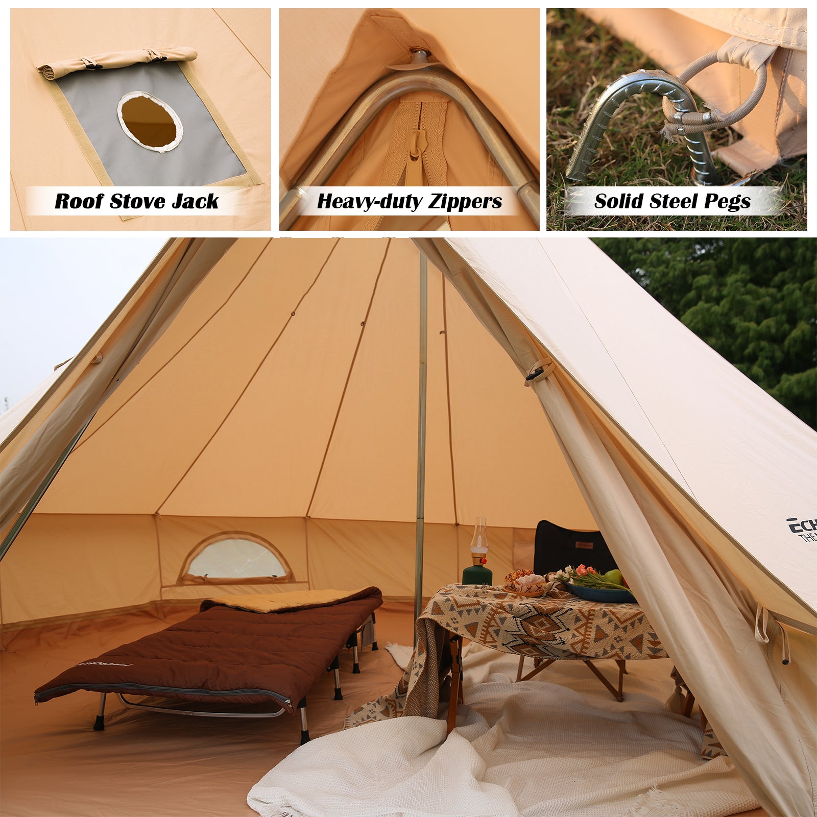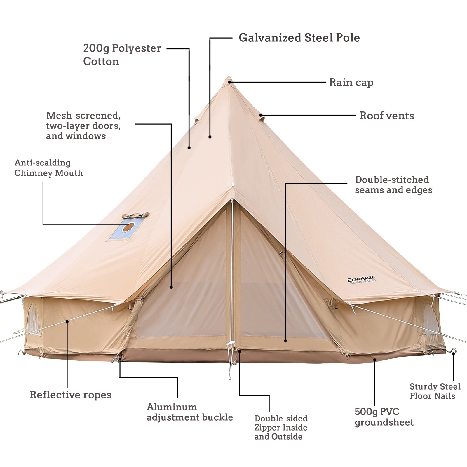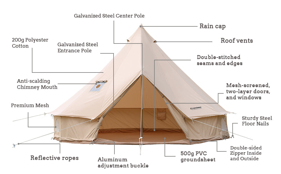 【QUALITY UPGRADE】We have improved our tent to achieve higher quality. The main improvement is of fiberglass tent pole. We cover junction of tent pole with heavy-duty steel protection tube, which adds more weight capacity to and prevents accidental breaking of tent pole to a large extent.