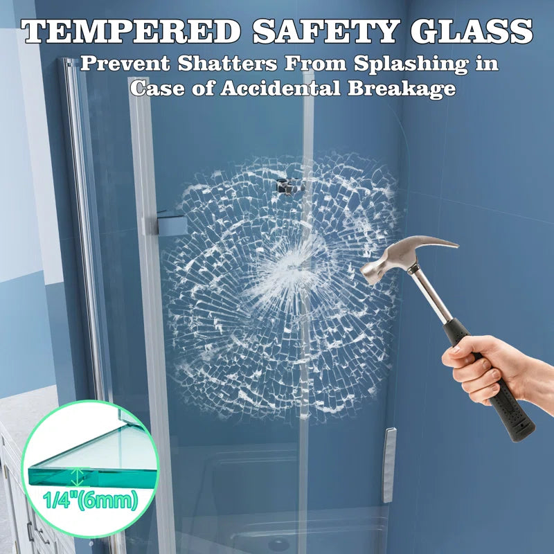 - This tub door is made of 6mm tempered safety glass which prevents shatters from splashing in case of accidental breakage. A safe round Conner design offers you safe space.