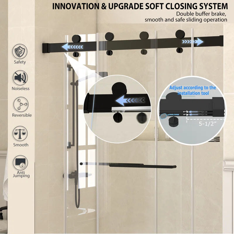 - Superior Design: This frameless shower door has a top support track with high load-bearing capacity, stable structure, and high safety. Rollers and pulls with an anti-jump system create effortless sliding operation. Two different innovative safe closing systems offer you to choose from, enabling the shower door to slide smoothly and quietly.