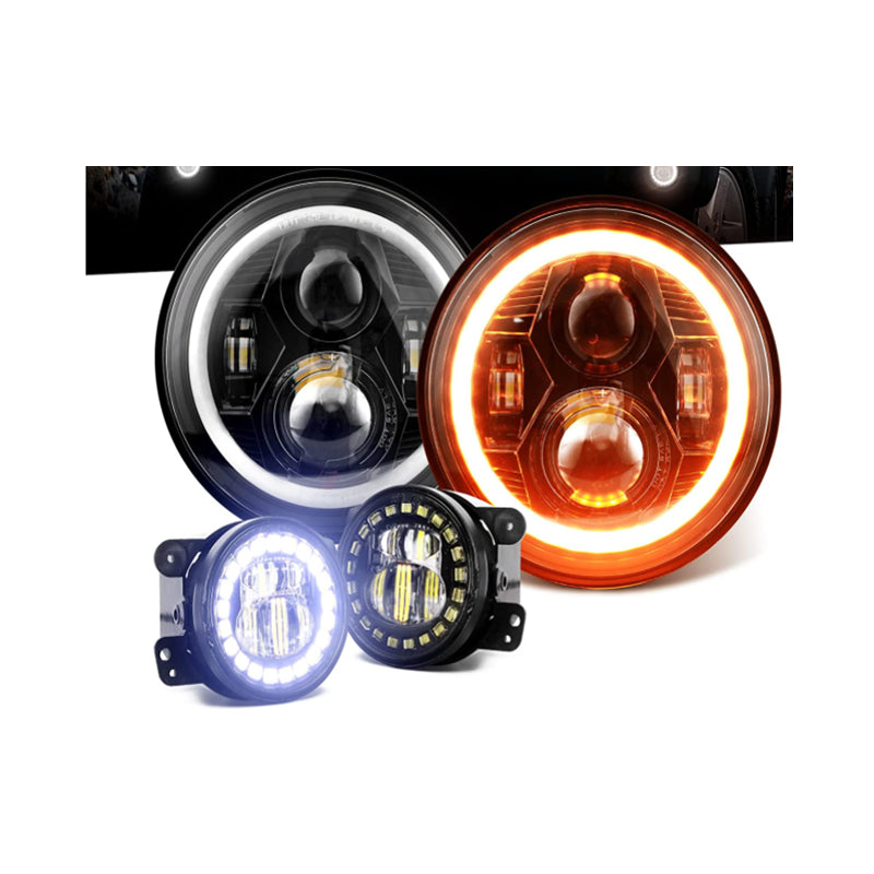7" Spider Headlight - Black with halo - 4" JK Clock Fog Light Black - 4PCS in set