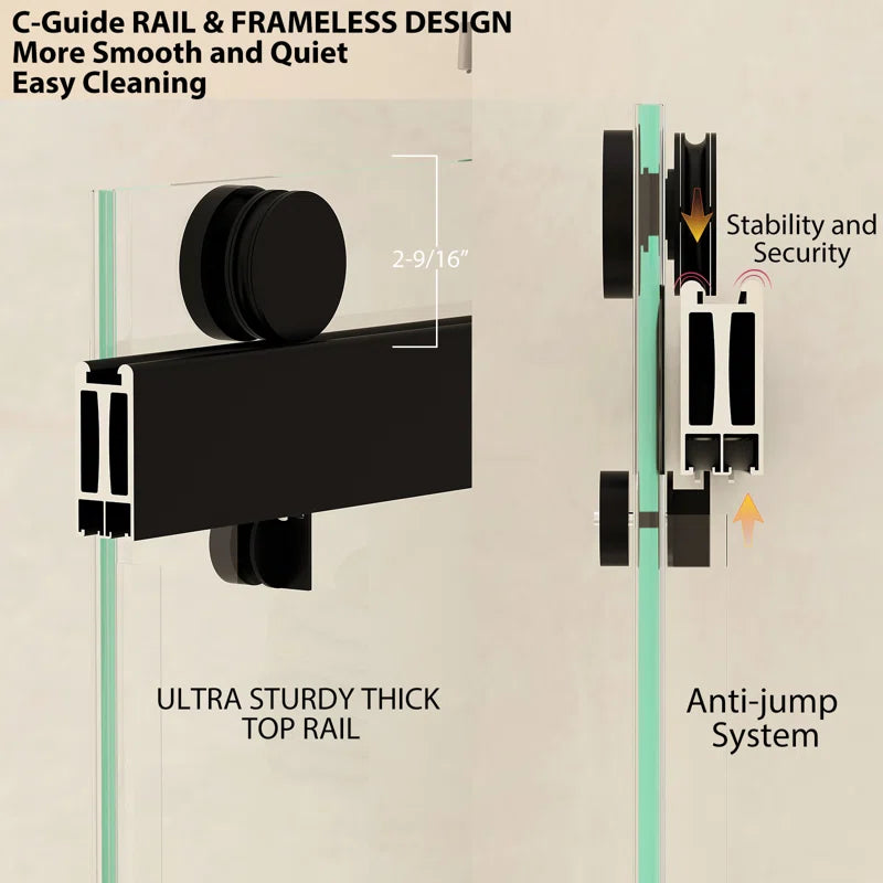 - Superior Design: This frameless shower door has a top support track with high load-bearing capacity, stable structure, and high safety. Rollers and pulls with an anti-jump system create effortless sliding operation. Two different innovative safe closing systems offer you to choose from, enabling the shower door to slide smoothly and quietly.