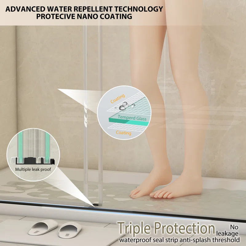 - Easy to Keep Clean: This clear tempered glass inside is professionally applied with a nano clear glass coating. This coating repels water and contaminates, and helps protect against staining and hard water build-up. It is easier to clean and maintain, yet maintains its high gloss, bright, shiny, and clean as new even after a long time. These frameless shower doors with bottom and side seal strips effectively prevent splashes and leaks from escaping the enclosure, achieving a dry and wet separation environment, and keeping the rest of your bathroom clean and tidy.