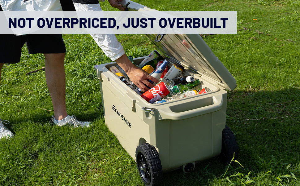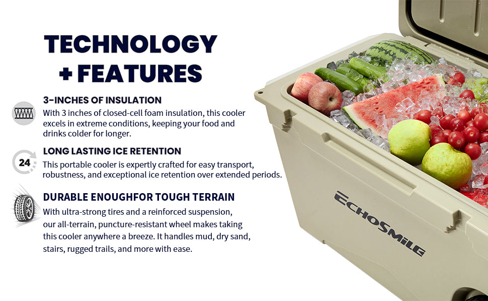 ① ICE RETENTION: EchoSmile Rotomolded cooler keeps cold for up to 5 days with recommended 2:1 ice-to-contents. The intermediate insulation layer is made of polyurethane so as to provide superior insulative and high strength. The silicone sealing ring seals the whole space to avoid heat convection and prolong the cryopreservation time.
