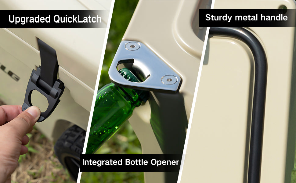 ④ ALL DETAILS: Silicon tension latches do not break easily or come loose automatically. UV inhibitors protect the cooler against sun damage. Anti-slide rubber feet help to keep stable. 2 impact rubber absorbing ergonomic grips on each side help easier moving. The drain plug allows you to remove water without turning the cooler upside down.