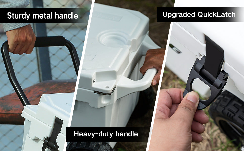 ④ ALL DETAILS: Silicon tension latches do not break easily or come loose automatically. UV inhibitors protect the cooler against sun damage. Anti-slide rubber feet help to keep stable. 2 impact rubber absorbing ergonomic grips on each side help easier moving. The drain plug allows you to remove water without turning the cooler upside down.