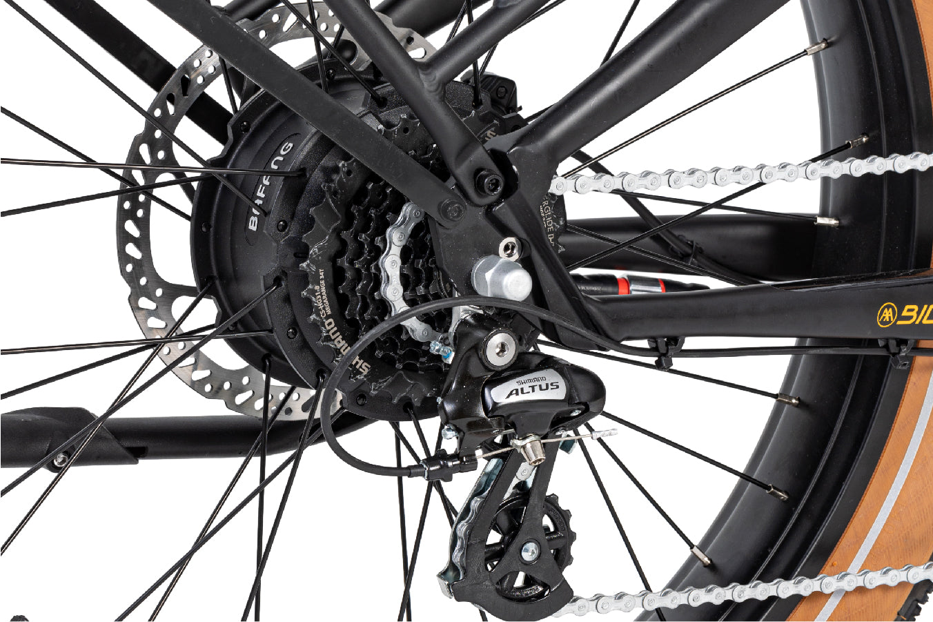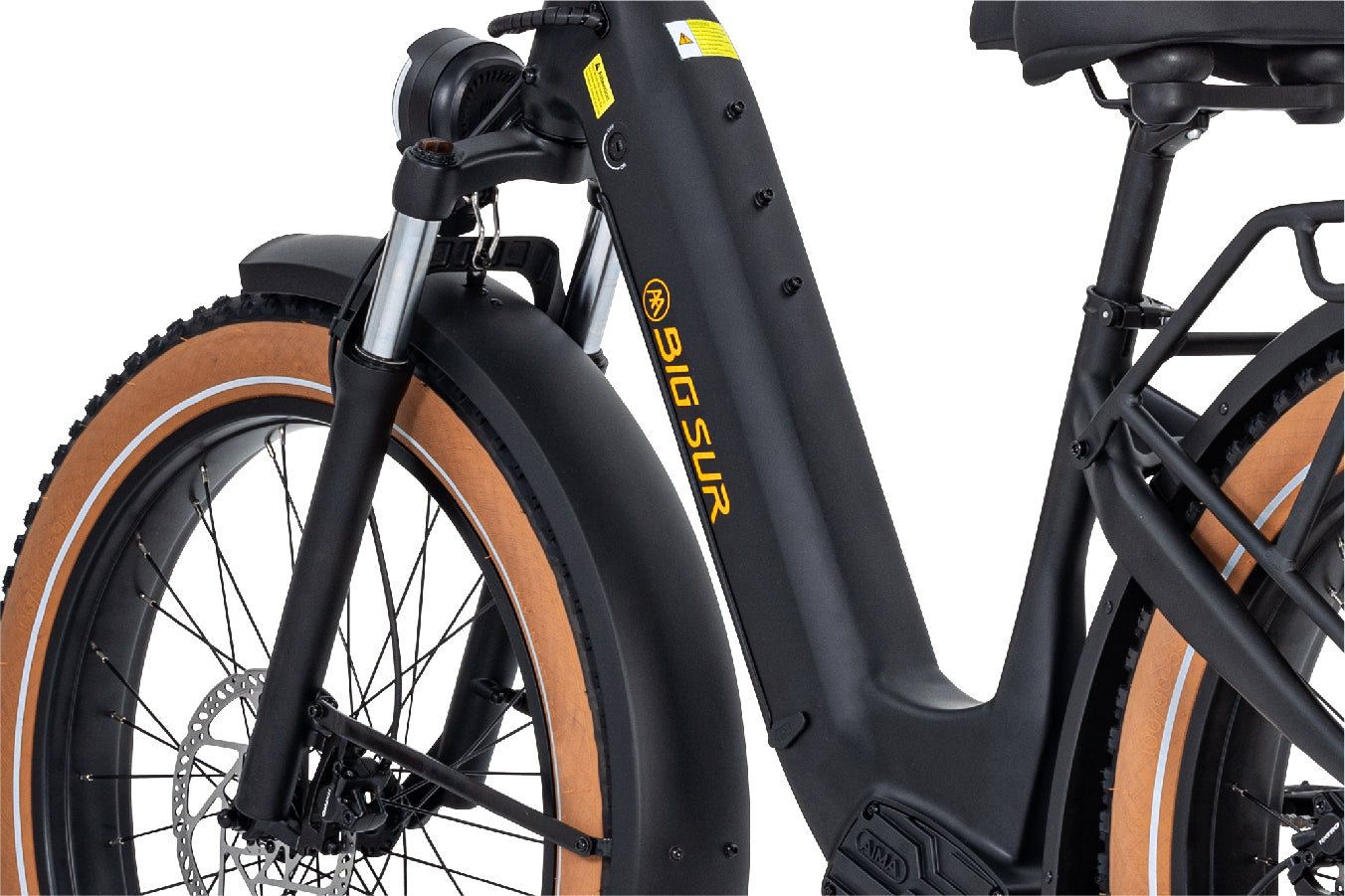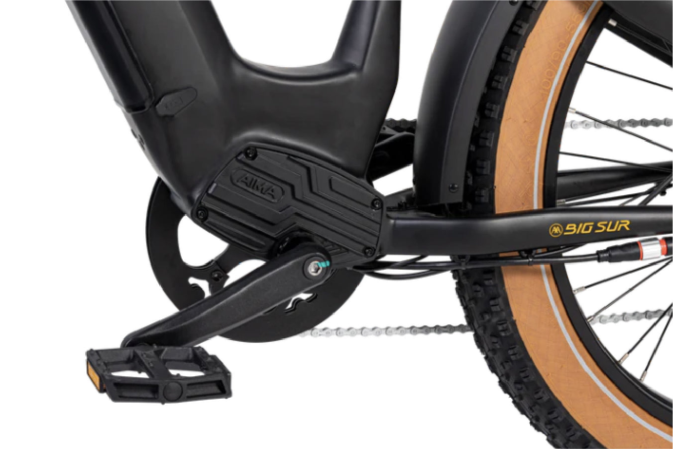 Big Sur is a 26” x 4” fat tire e-bike with 750W powerful Bafang motor designed for all terrains. As a class2/3 e-bike, its speed can go up to 20mph on throttle mode and 28 mph on PAS mode. And specially-designed big headlight and big rotor along with LG 21700 big battery cells make Big Sur one of the safest e-bikes. Besides, equipped with 52T big crankset and AIMA Comfort big saddle, Big Sur provides riders with remarkably comfortable and smooth riding experience.