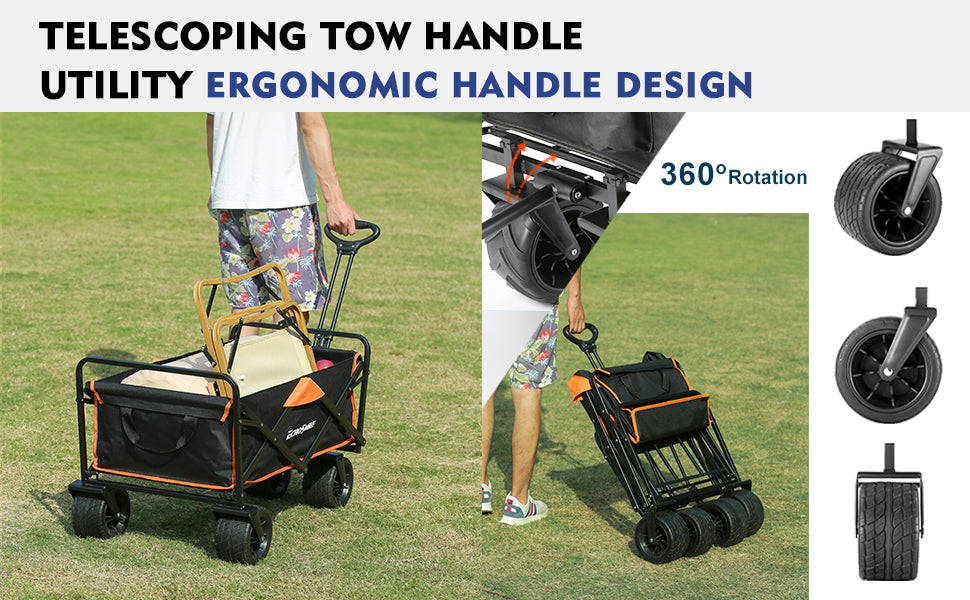 ④ Adjustable Handle: The tilting pulling handle of the folding beach wagon is telescopic with an adjustable length of 20" to 30" for a comfortable height; a handle with a locking system keeps it in place. The adjustable handle makes it easy to pull the beach cart wagon when it's heavily loaded.