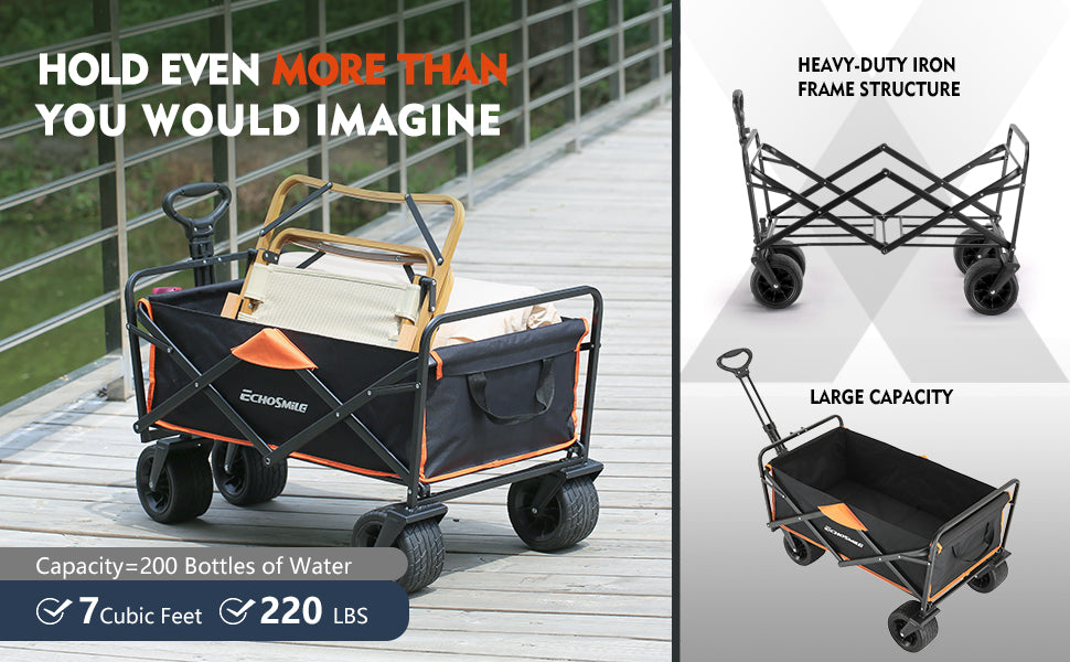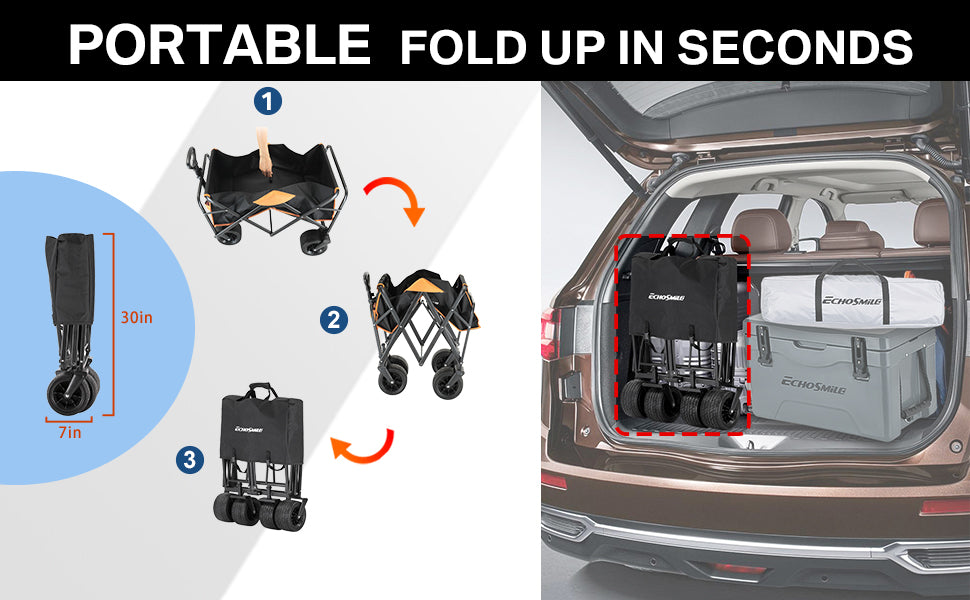 ② Fast Set-Up & Fold: No assembly required for EchoSmile big collapsible wagon heavy duty. A convenient size for both storage and expanded use. Fast and easy to set up in seconds and has an attached handle to move the beach cart. This folding heavy-duty wagon can be folded compactly to store easily in a compact car, or garage, ensuring easy transport.