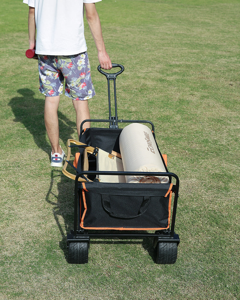 Fast and easy to set up in seconds and has an attached handle to move the beach cart. This folding heavy-duty wagon can be folded compactly to store easily in a compact car, or garage, ensuring easy transport.