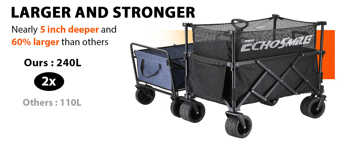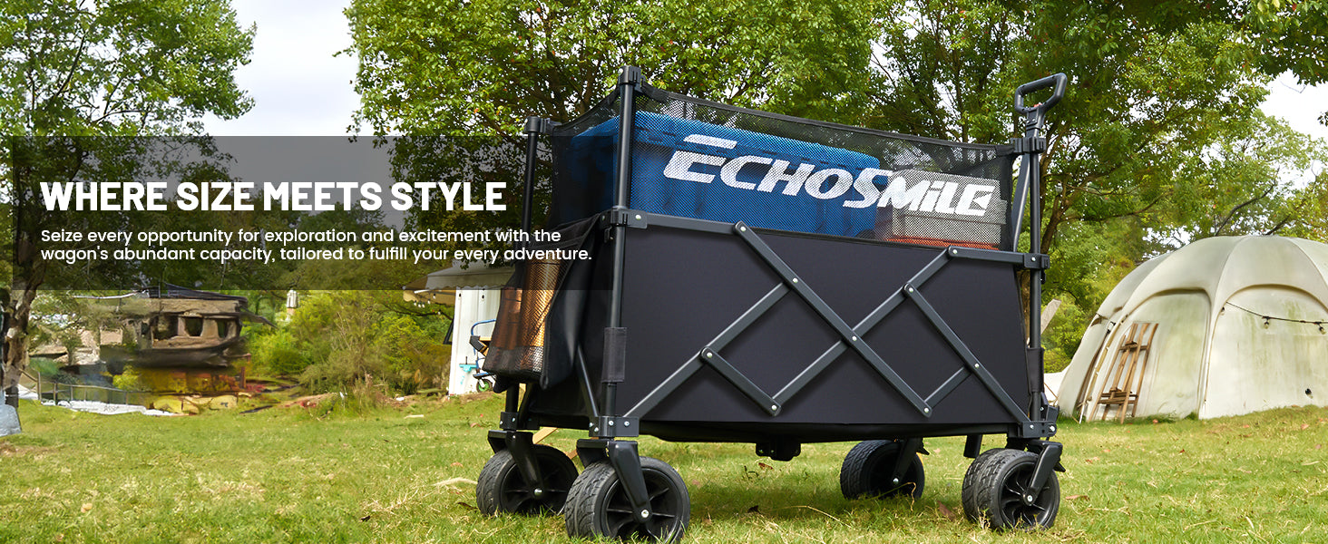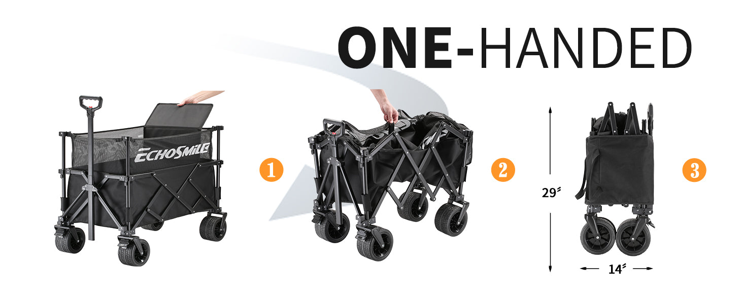 ③ Easy Portability: No assembly hassles - just pull the bottom strap, and you're ready within seconds. This wagons carts foldable is conveniently compact when folded, measuring 14 inches in length, 9.4 inches in width, and 29 inches in height. EchoSmile foldable wagon effortlessly fits in your car's trunk, garage, or closet for easy transport and storage.