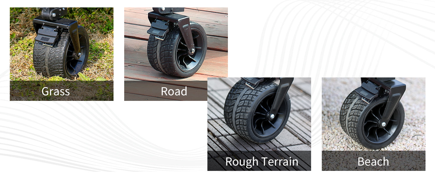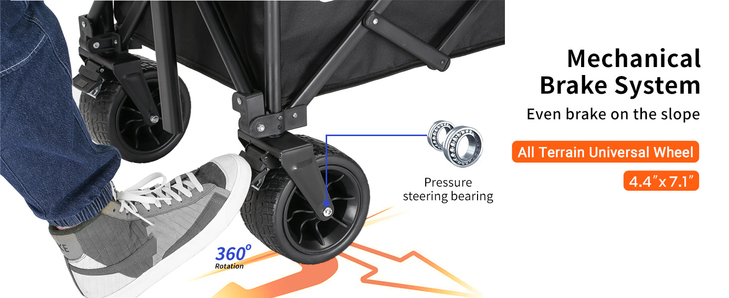 ④ All-Terrain Wagon Wheels: Our beach wagon cart with big wheels ensures smooth movement with its 4x7 inch all-terrain wheels. The front wheels come with a locking brake for instant immobilization when needed. Whether you're fishing, camping, shopping, or gardening, the 360-degree rotating front wheels enhance maneuverability.