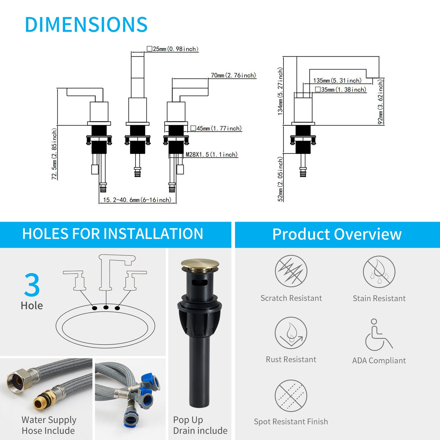- [EASY INSTALLATION]: The brushed nickel bathroom faucet comes with a plastic Pop up Sink Drain Assembly with Overflow and 2 high-density solid braided nylon tub water supply lines. 4-inch centerset and 3 hole mount design allow for easy installation. Detailed installation instructions will guide you on how to perform installation quickly.