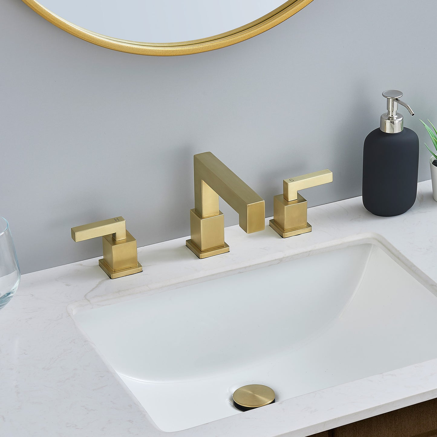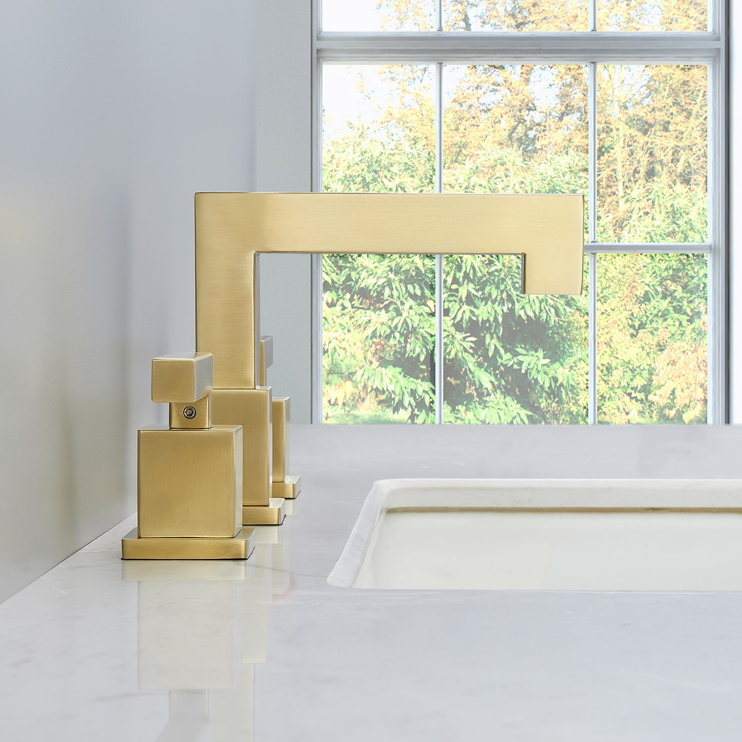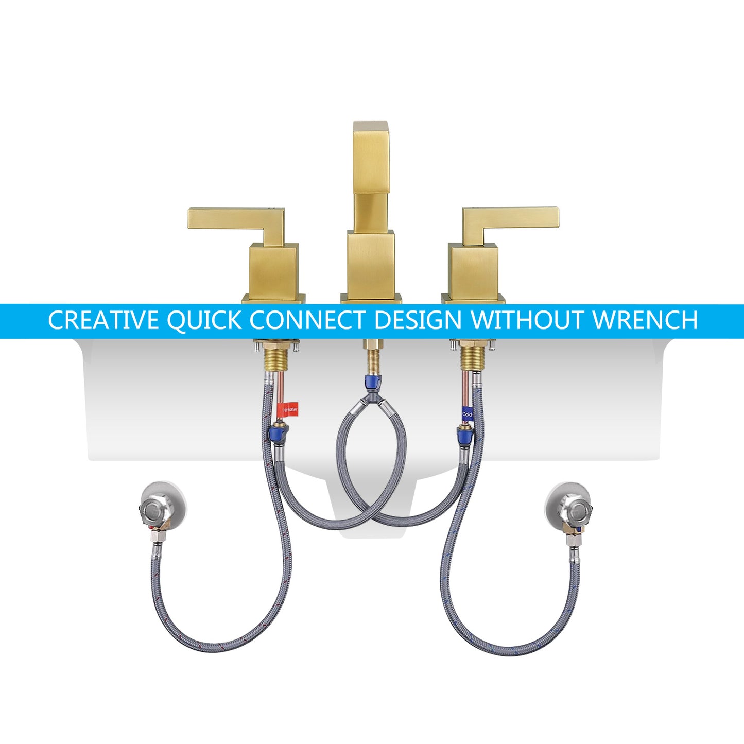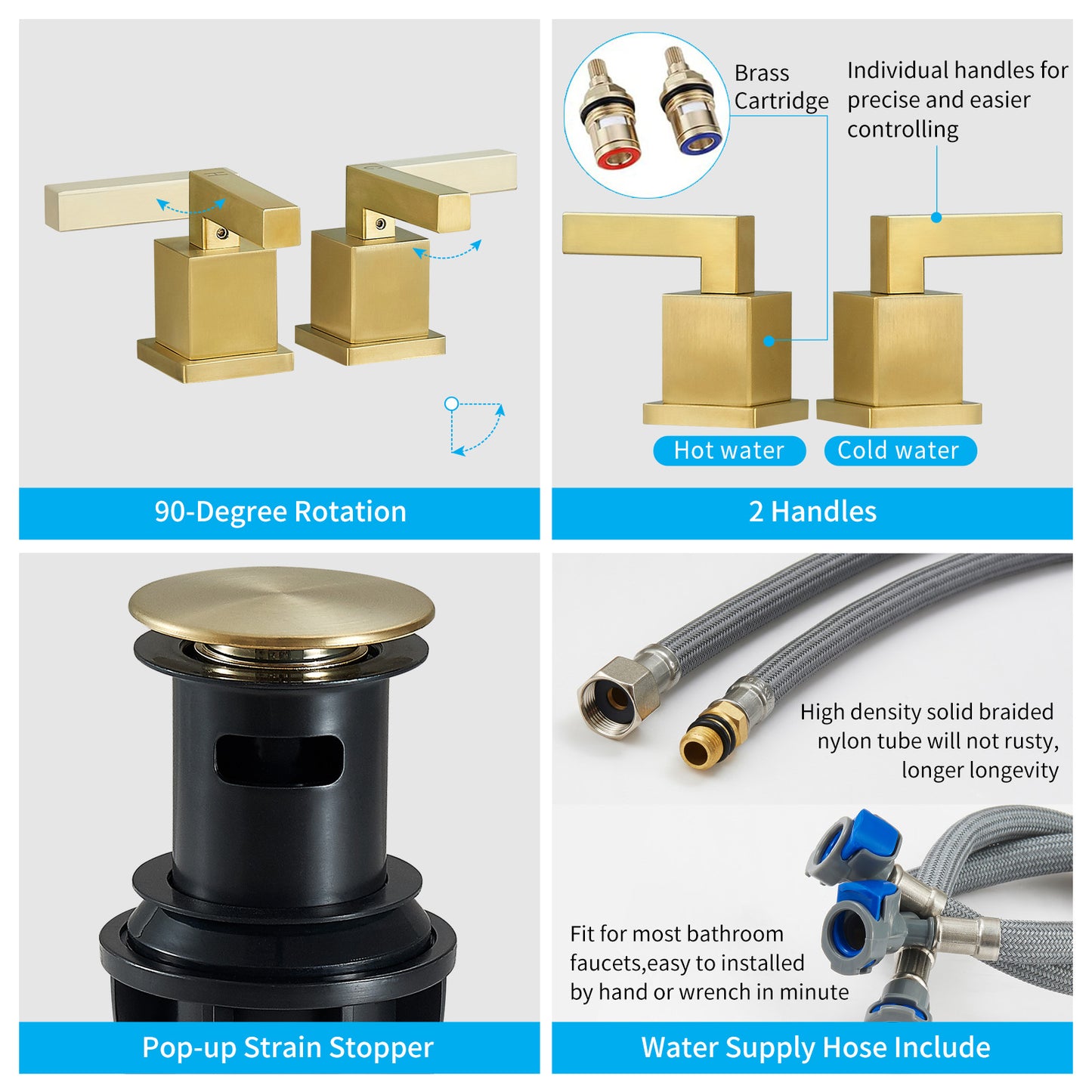 PK-018-LJ | Brushed Gold 3-Hole Low-Arch 8 Inch Widespread Bathroom Faucet, Vanity Sink Faucet with Metal Pop Up Drain Assembly and Water Supply Lines for Lavatory